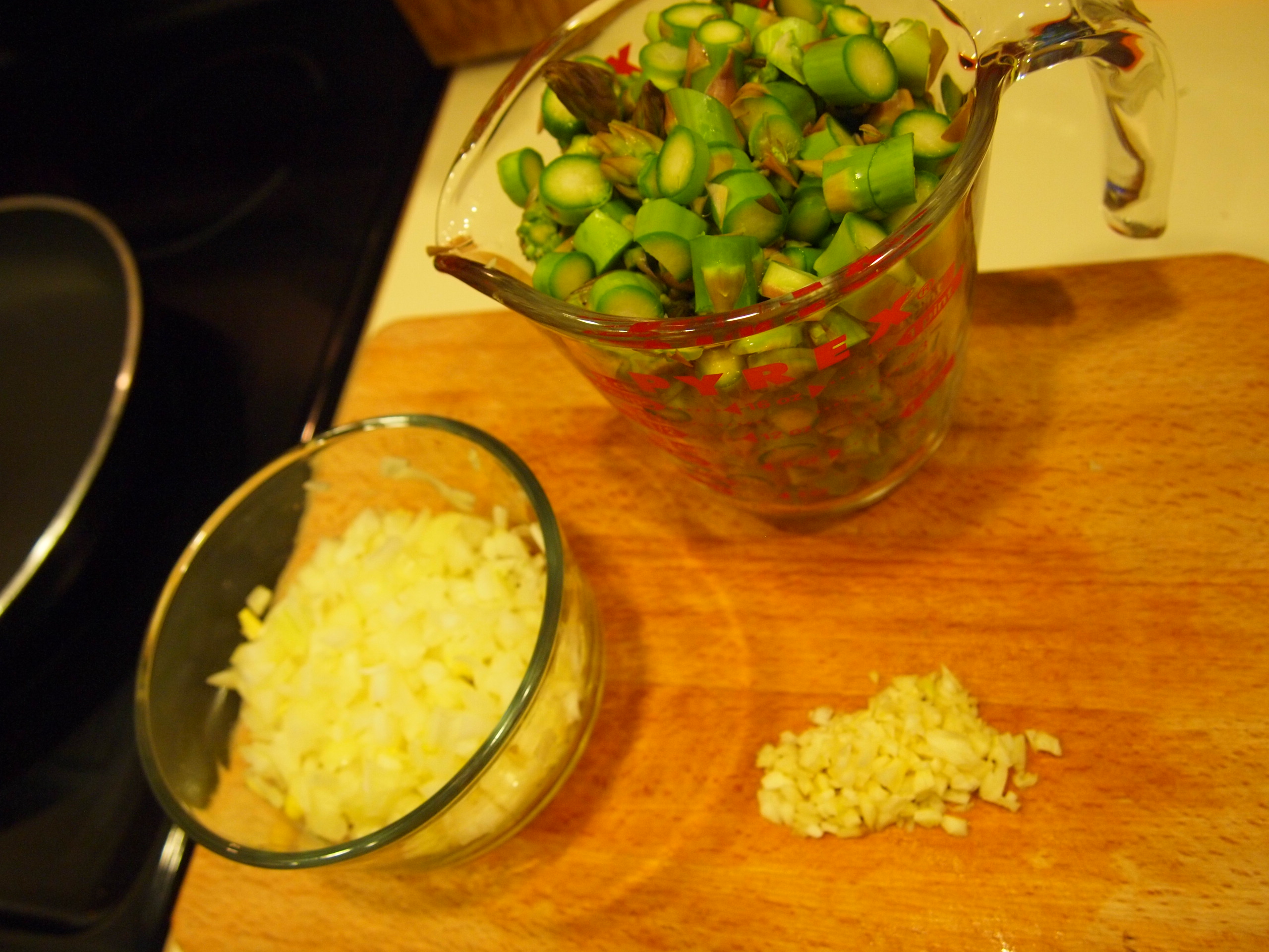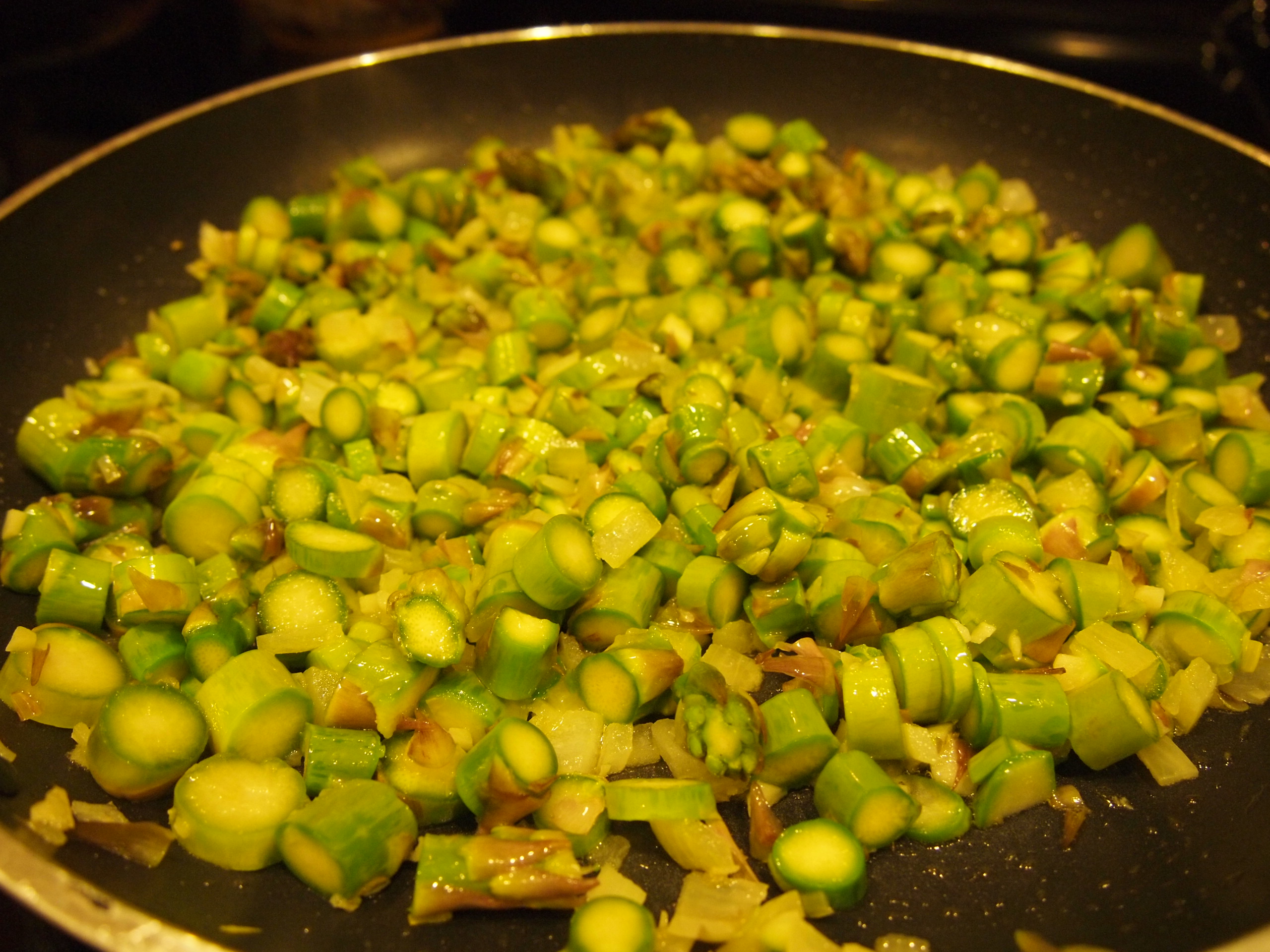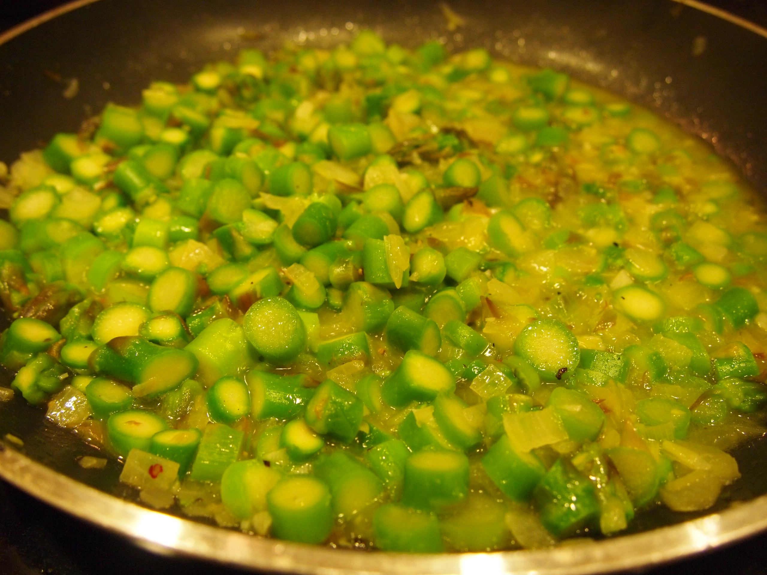 Once the asparagus is coated well in the hot oil add in the water and continue to cook for 6 minutes, until the asparagus is tender.