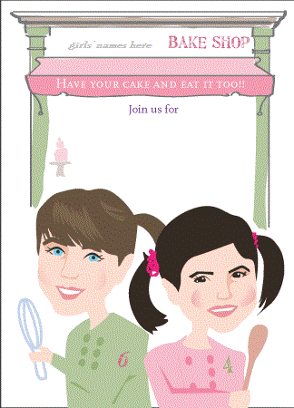 Since we nailed down the theme by this point, my thoughts for the invitation were to keep it focused on the girls and the theme. With the shortest conversation ever about an invitation, all I mentioned was that it should look vintage with the girls at a bakery, my husband created below.