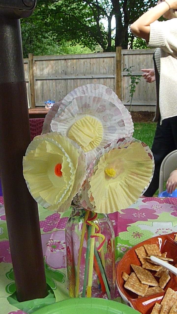 The decor. With the Cake Boss theme given to me, at first, I was stumped at trying to keep it youthful, feminine and cake related. For some inspiration, I started going through my stash of party supplies. Years ago, I had bought some paper tablecloths from Pier 1, that struck me as perfect for the girls’ party. I always buy things on sale if I like them cause you just never know when you’ll need them! These tablecloths were bright pink, white, and lime green floral; very shabby chic. These tablecloths gave me the color scheme for the party; bright pink and lime green. To coordinate, I had bought lime green colored tablecloths for the food table, and bright pink matching tableware for lunch, and, lime green for dessert. To add the cake inspired whimsy, I made two types of garland; one from white doilies and another from multi-colored cupcake liners. The doilies were strung side by side to make a wide, chic garland for above the drink table. Then for the other garland, I strung a few left over doilies along with cupcake liners in a pattern, all different pastel colors and the aluminum ones, too, through the centers to create a ruffled effect. These were strung along the doors and inside the kitchen. Both were so darling. Then I made paper flowers for the tables. Shaped cupcake liners with my fingers to appear like flower petals. Some were flattened open, some were crinkled, and some were glued in a folded patter to simulate a flower’s center. Then poked pipe cleaners through the centers, and fashioned them as flowers in glass milk containers scattered around the tables. Super cute!