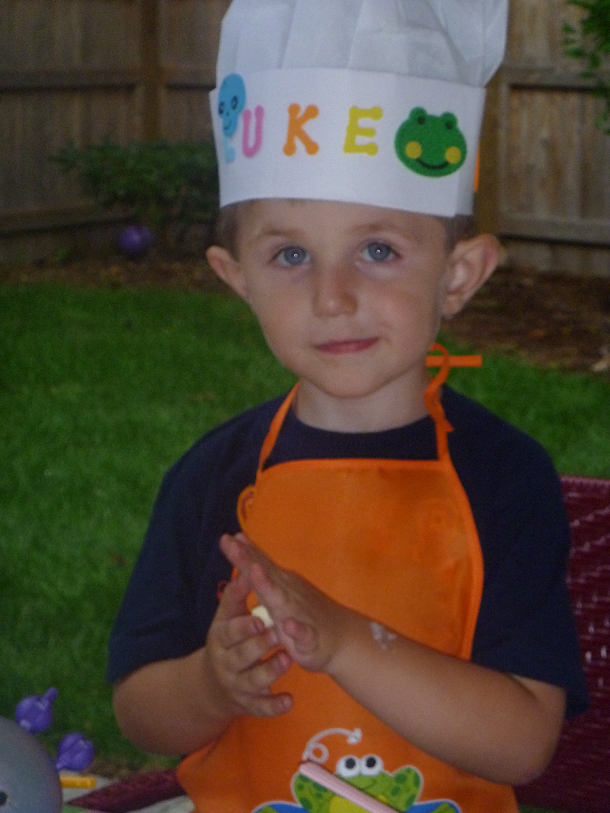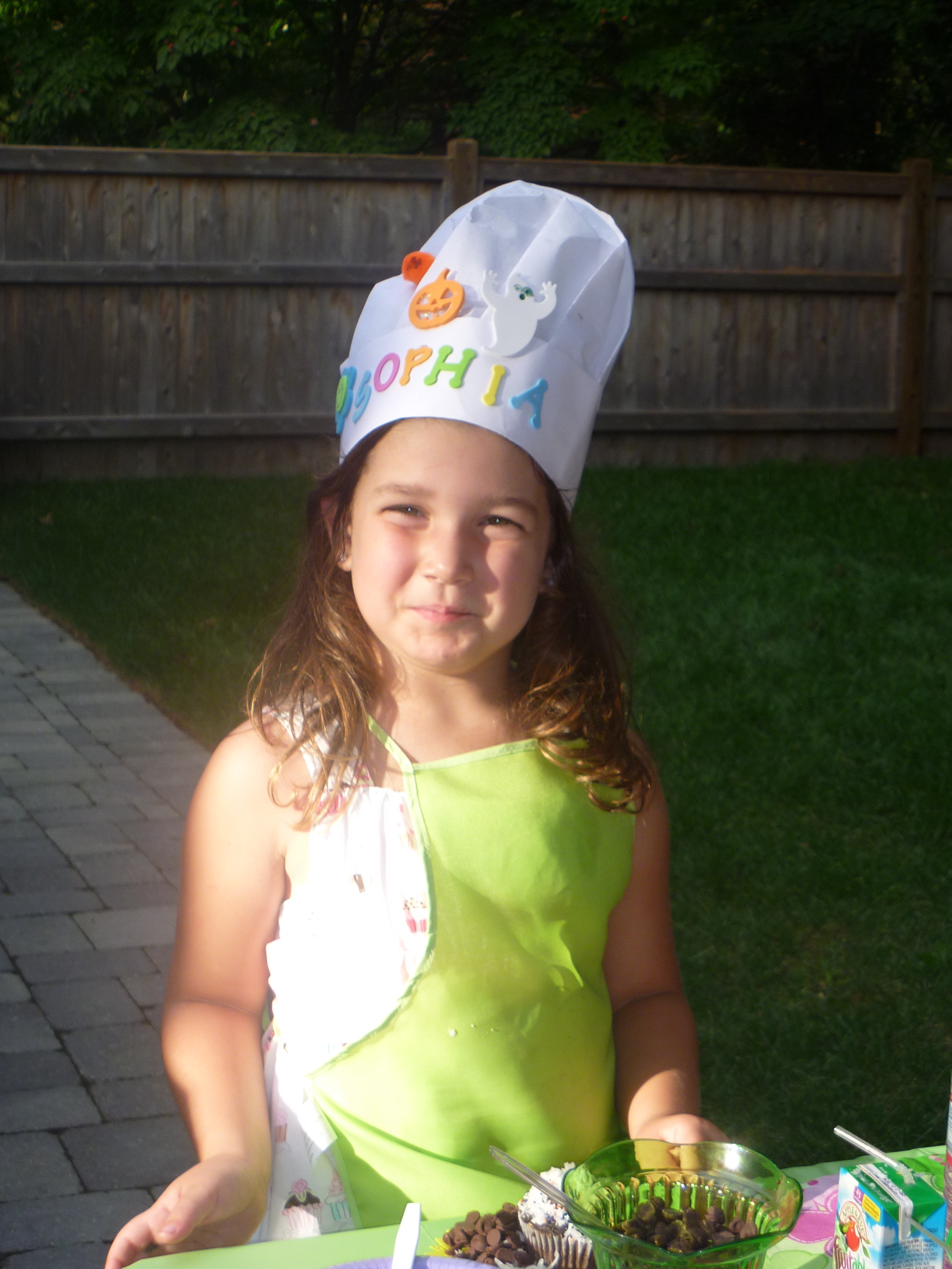The chef’s toques were child-sized, and made of paper. Very easy to size on each child’s head. Then each table was topped with a bowl of pom poms, Halloween themed foam stickers, doilies, glue sticks, glitter glue and other stick on decorations for the kids to decorate. The aprons; I had bought them at our local dollar store and came in a variety of colors. The only issue was they had cartoon animals/bugs on them, like frogs and ladybugs, as they were being sold for bug capturing. So, to fix that issue, I had created and affixed a themed pink and green sticker across the chest that read: I am the Cake Boss. Unfortunately, the kids peeled them off to reveal the cartoons cause they loved them more, it was still cute, but I wasn’t able to take photos of them in the aprons with the stickers.