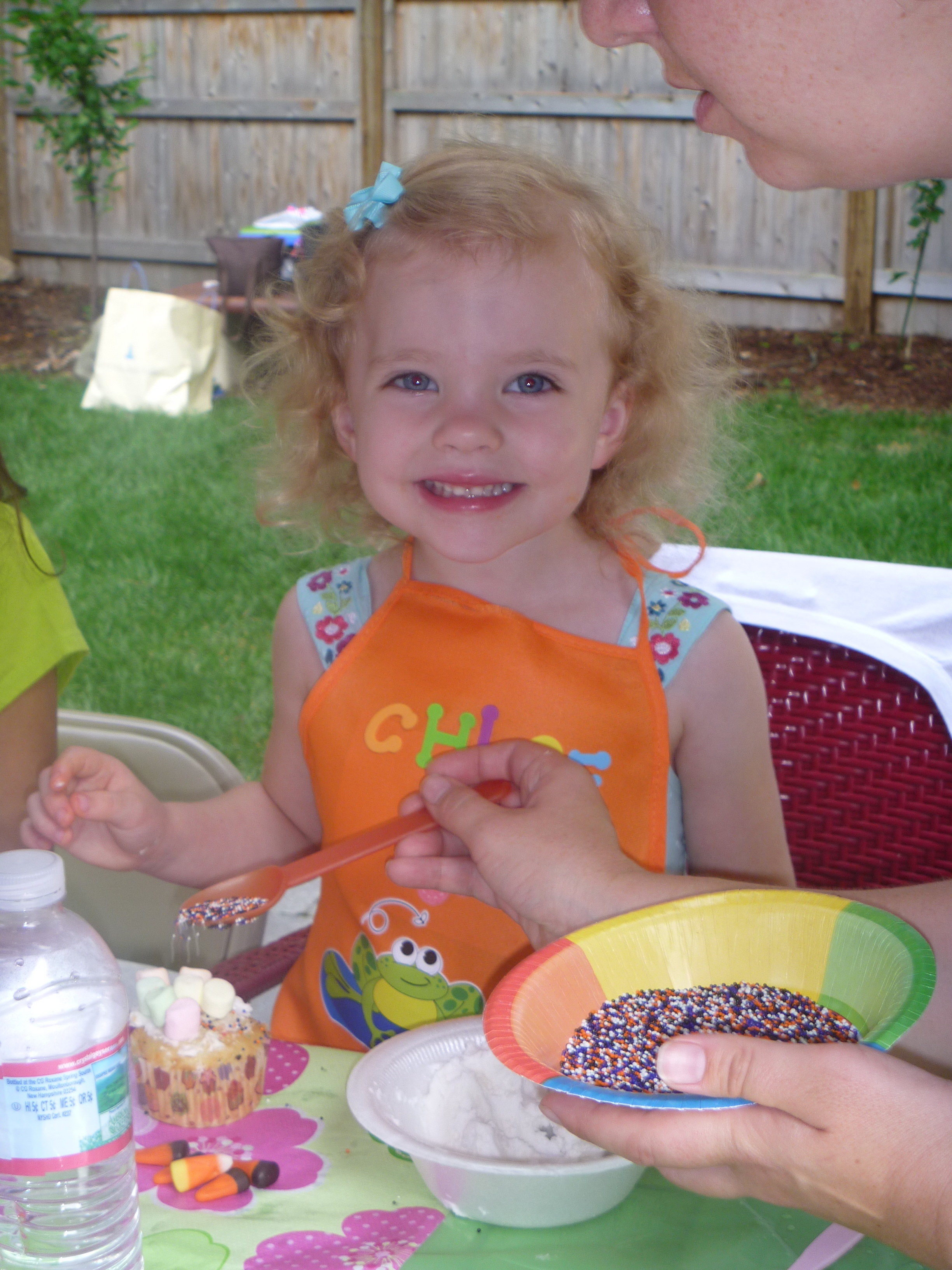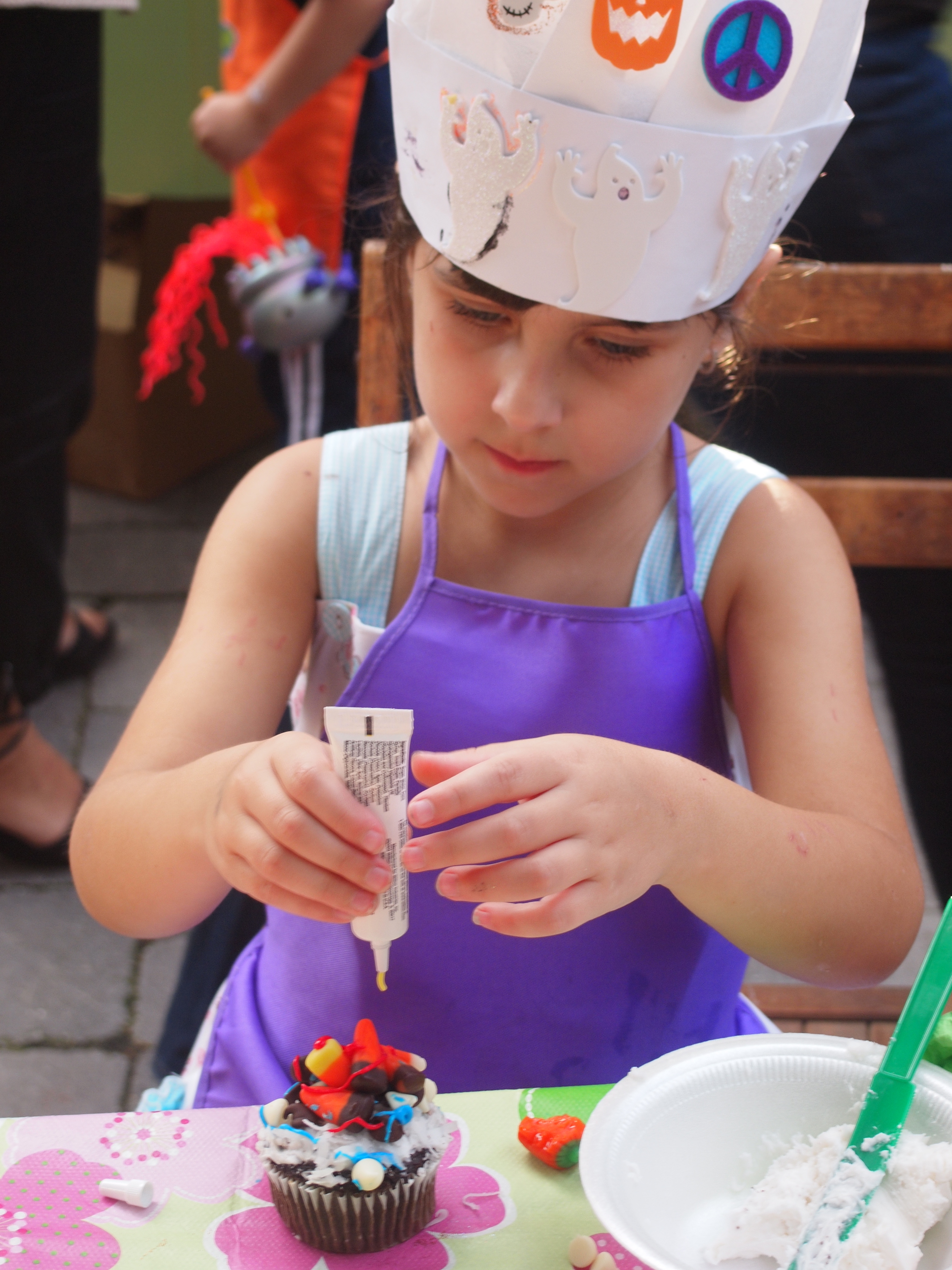 After lunch, and running around the yard, the kids were gathered around their table for their third craft. They were given a homemade cupcake of their flavor choice, either chocolate or vanilla cake, wrapped in a cake themed liner. Then they were given a bowl of our white buttercream frosting along with a plastic spoon and knife. Then each table was supplied with sprinkles, marshmallows, white chocolate and milk chocolate chips, candy corns in traditional shapes and pumpkin shapes, and gel tubes of icing. The kids were also given a paper plate to place the cupcake, to sprinkle and draw on, but none of the kids wanted to use them. I don’t know why. But. The kids had a lot of fun piling their toppings sky high.