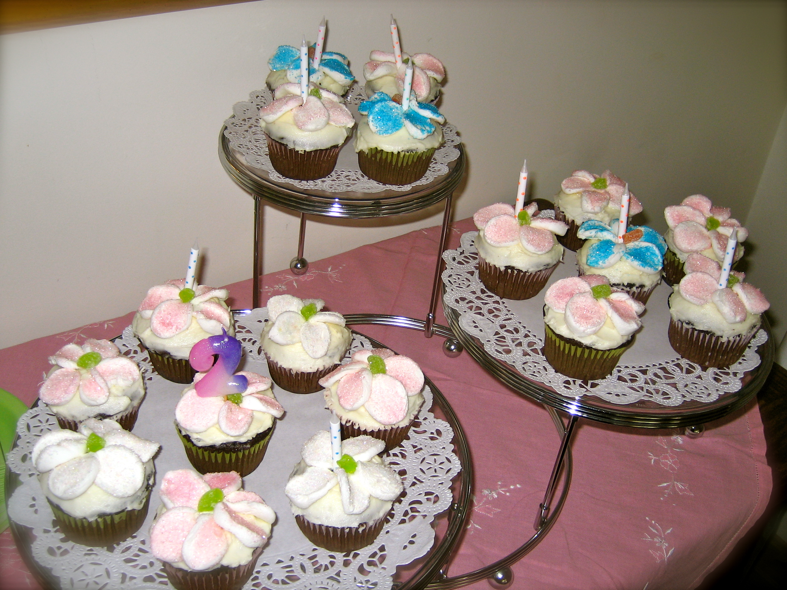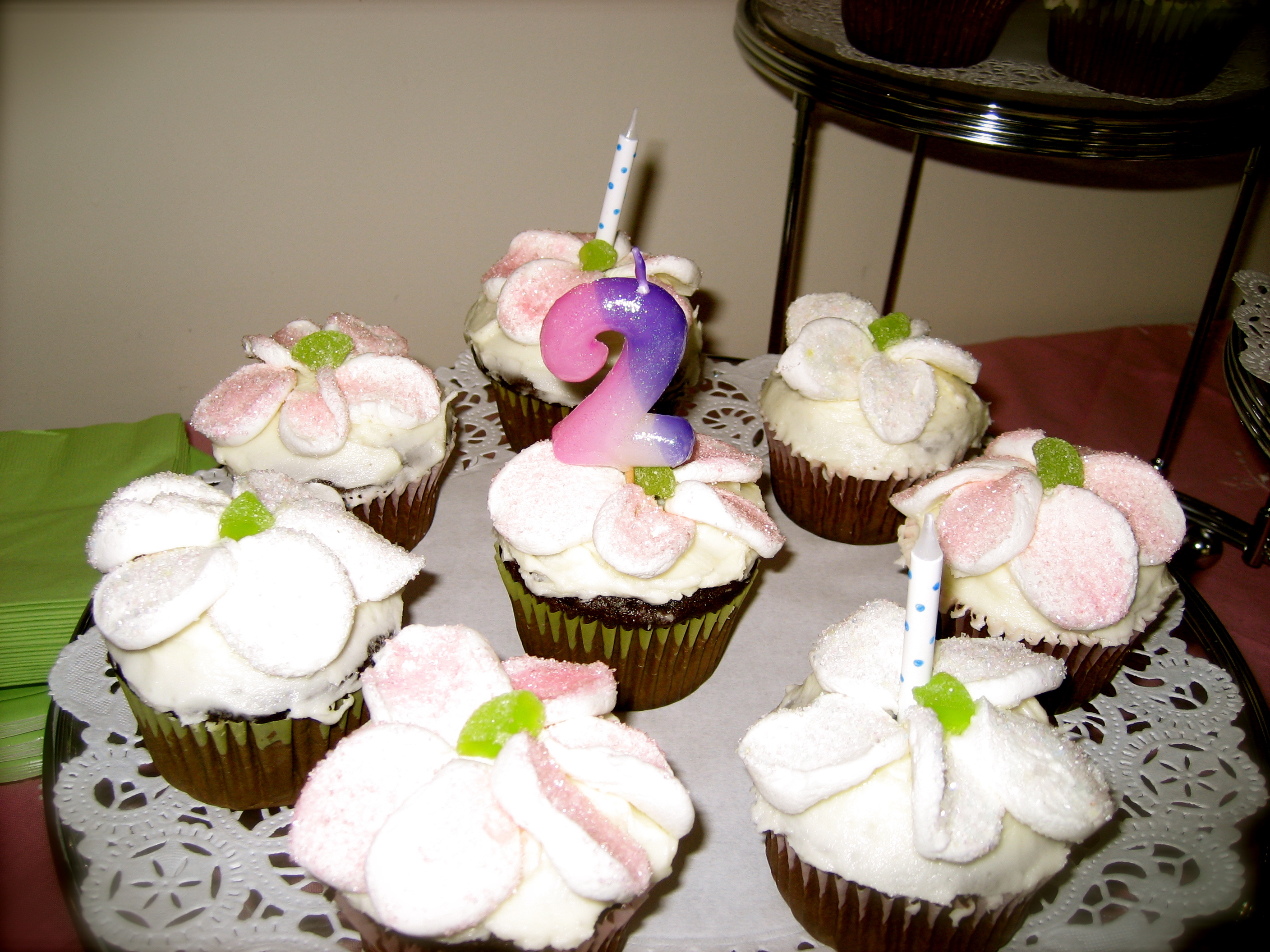 The cupcake idea was a brainstorm of my husband and mine after seeing candy butterflies in a cupcake book I bought for this occasion. But as we started to cut and place them on top, the flowers were naturally appearing and were prettier. Our oldest daughter loved them!