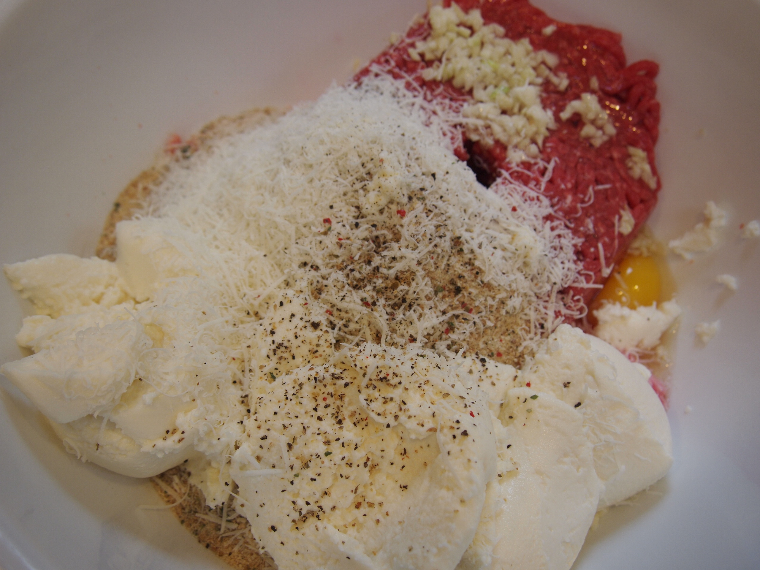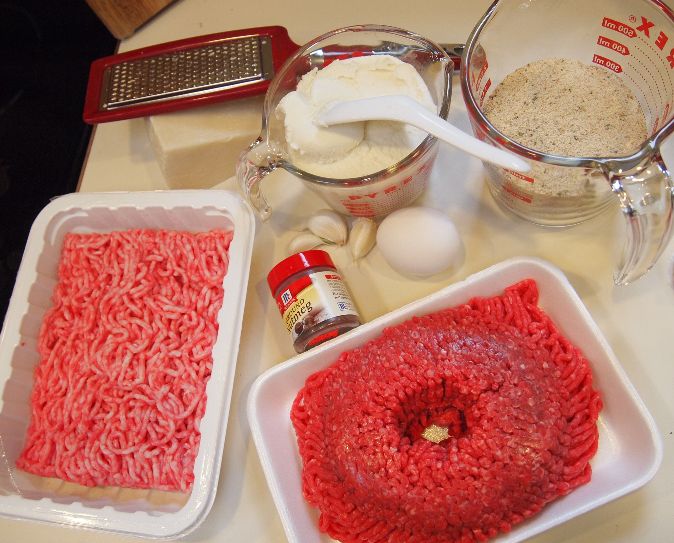 In a large bowl, add the ground beef, veal, nutmeg, egg, that bread crumb mixture, garlic, ricotta, grated cheese and S&P.