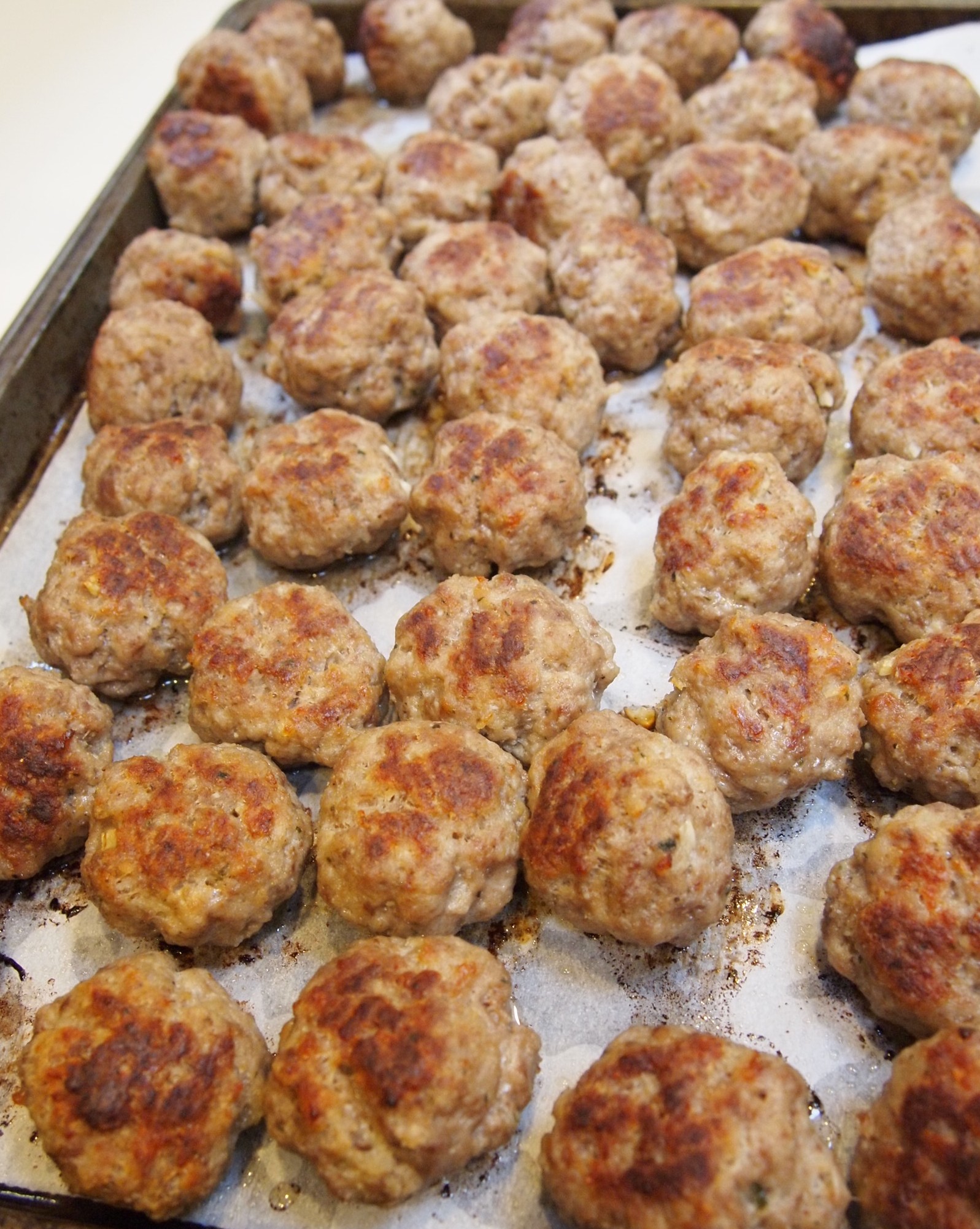 Next, using your hands, shape the meatballs into balls, about the size of a walnut/1 inch, and place on baking sheet.