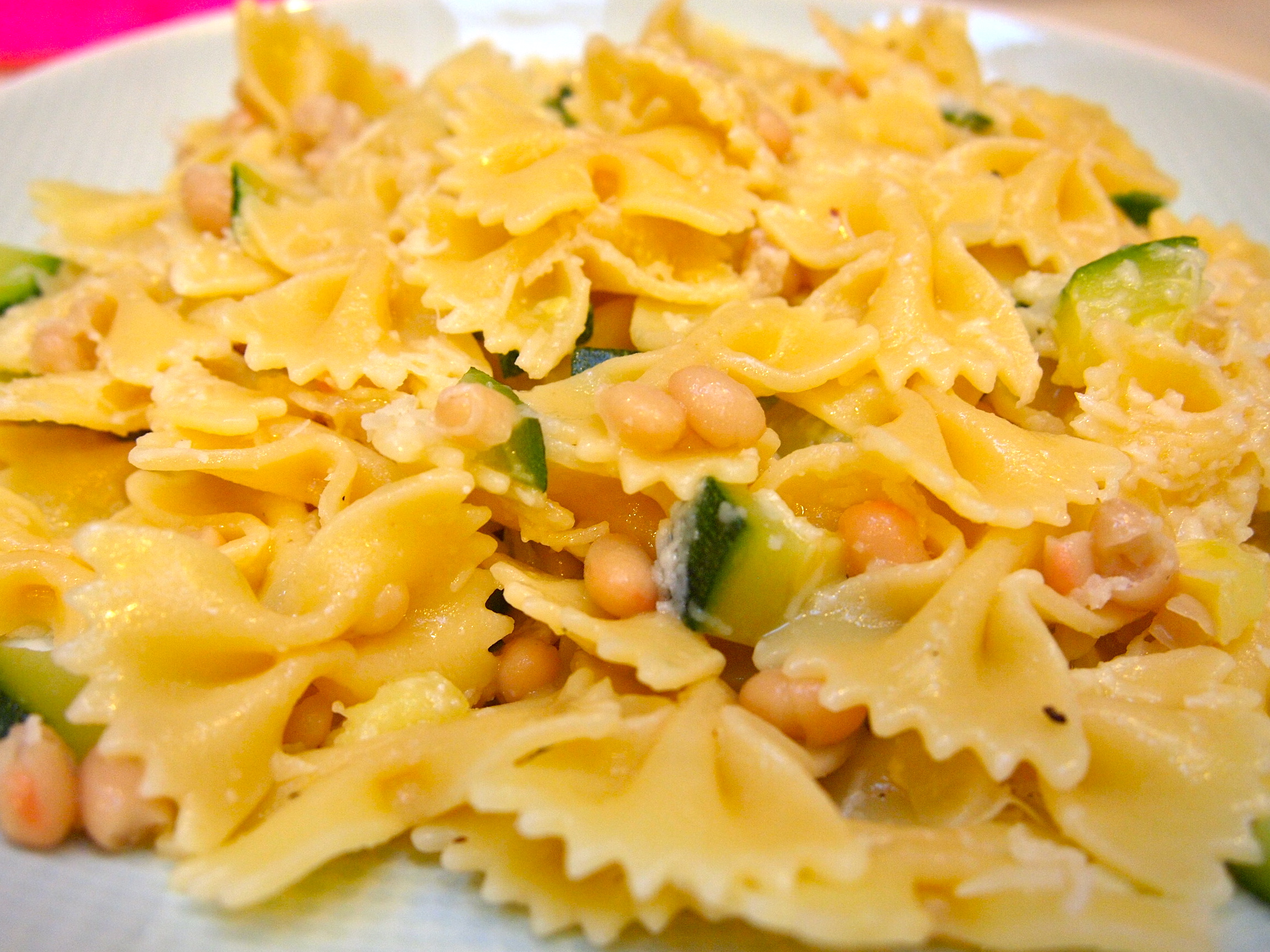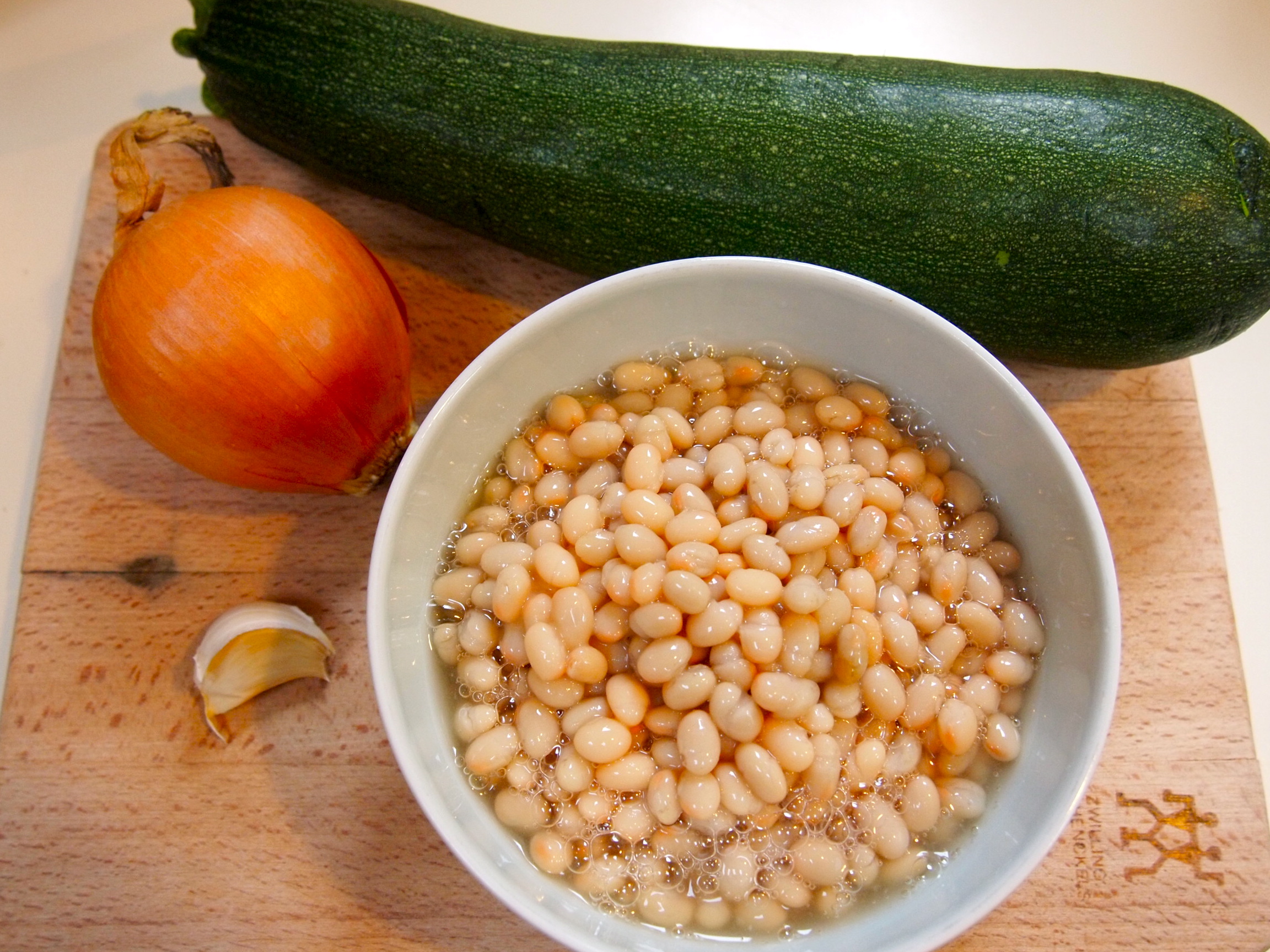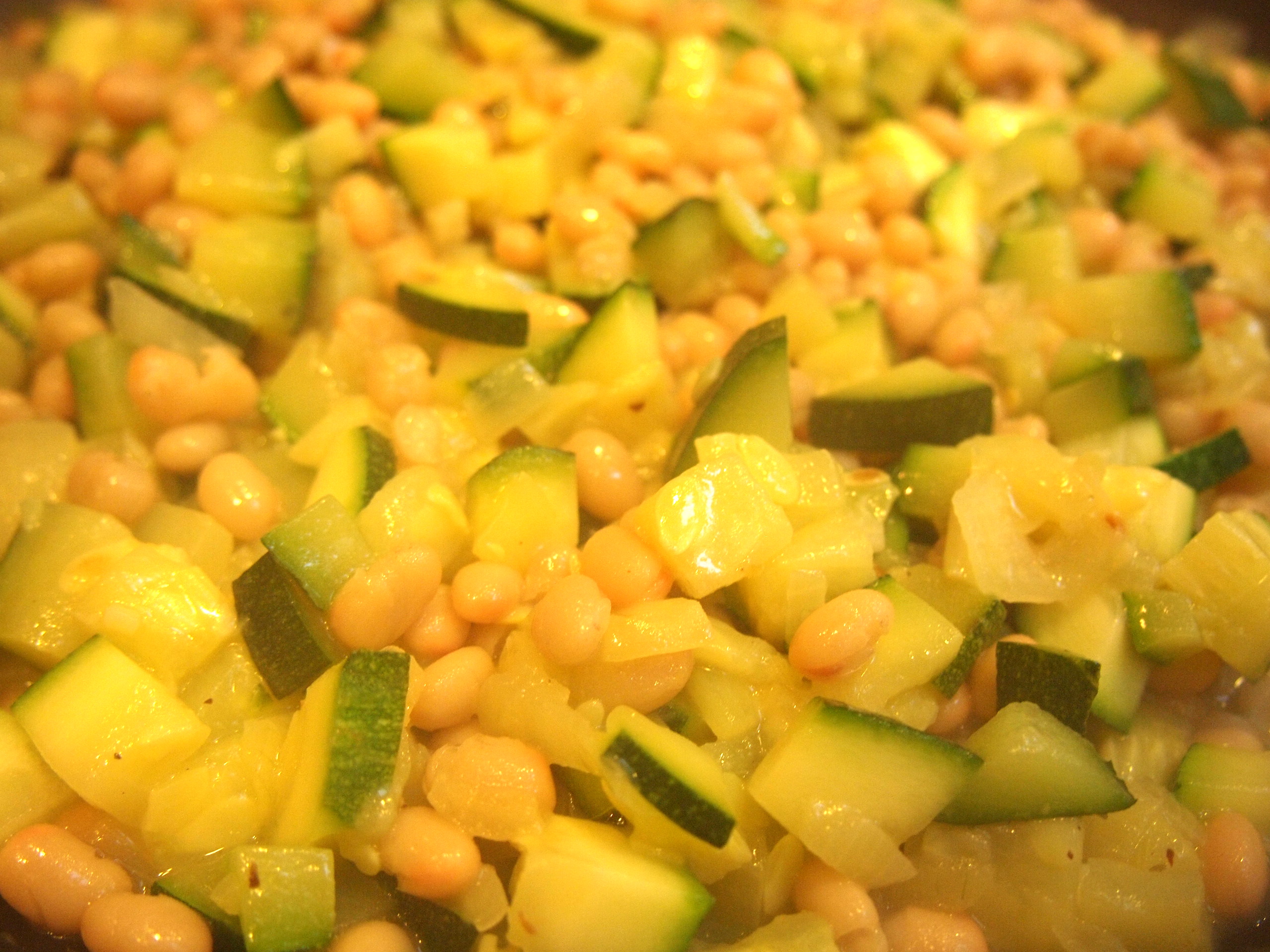 Push the zucchini to one side of skillet, and add in the beans to the empty side. Let beans heat through, then mix the zucchini with the beans till incorporated.