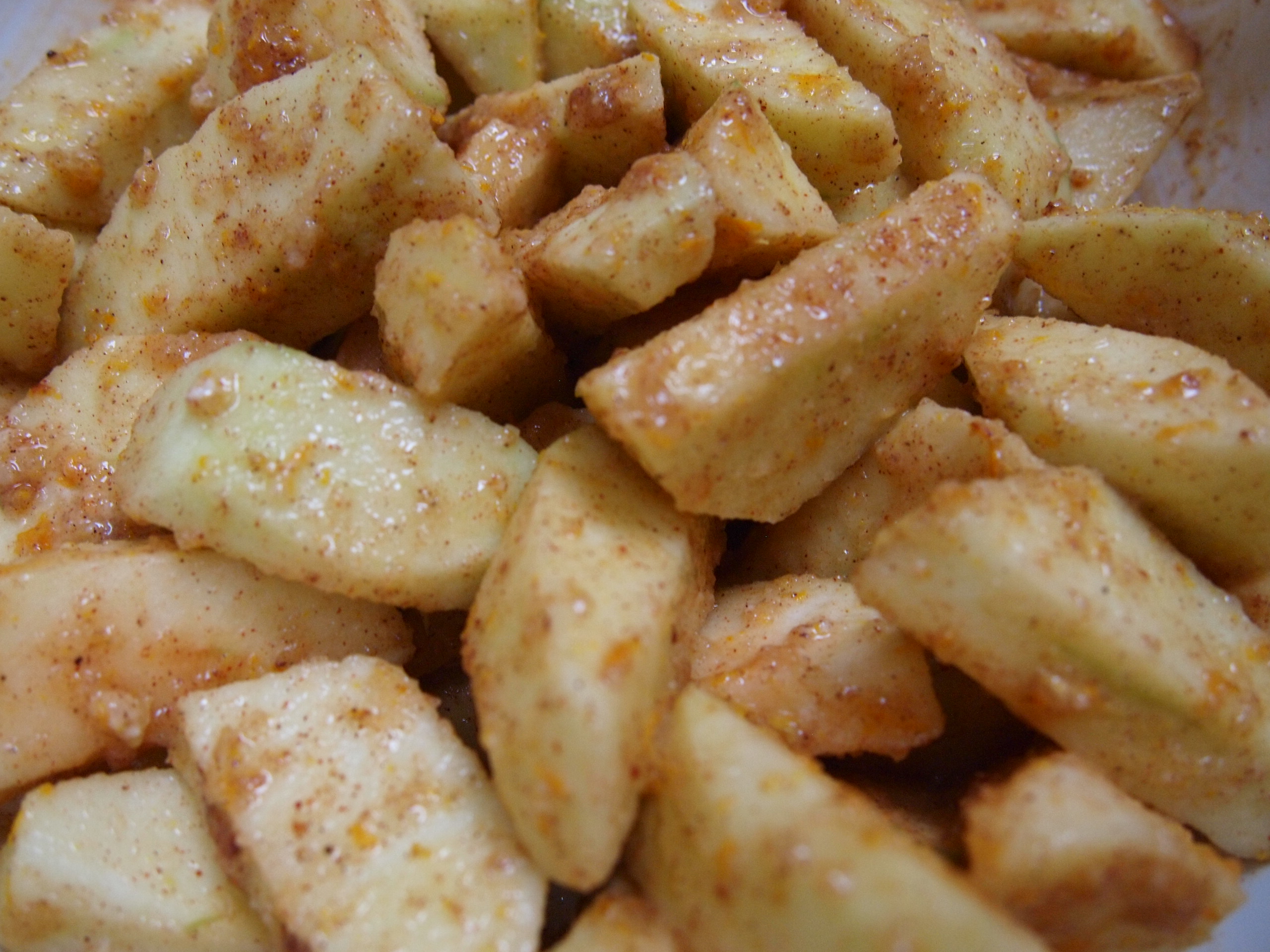 Combine in a bowl: cut apples with the zests, juices, 1/2 cup sugar, flour, salt, cinnamon, nutmeg, and allspice.