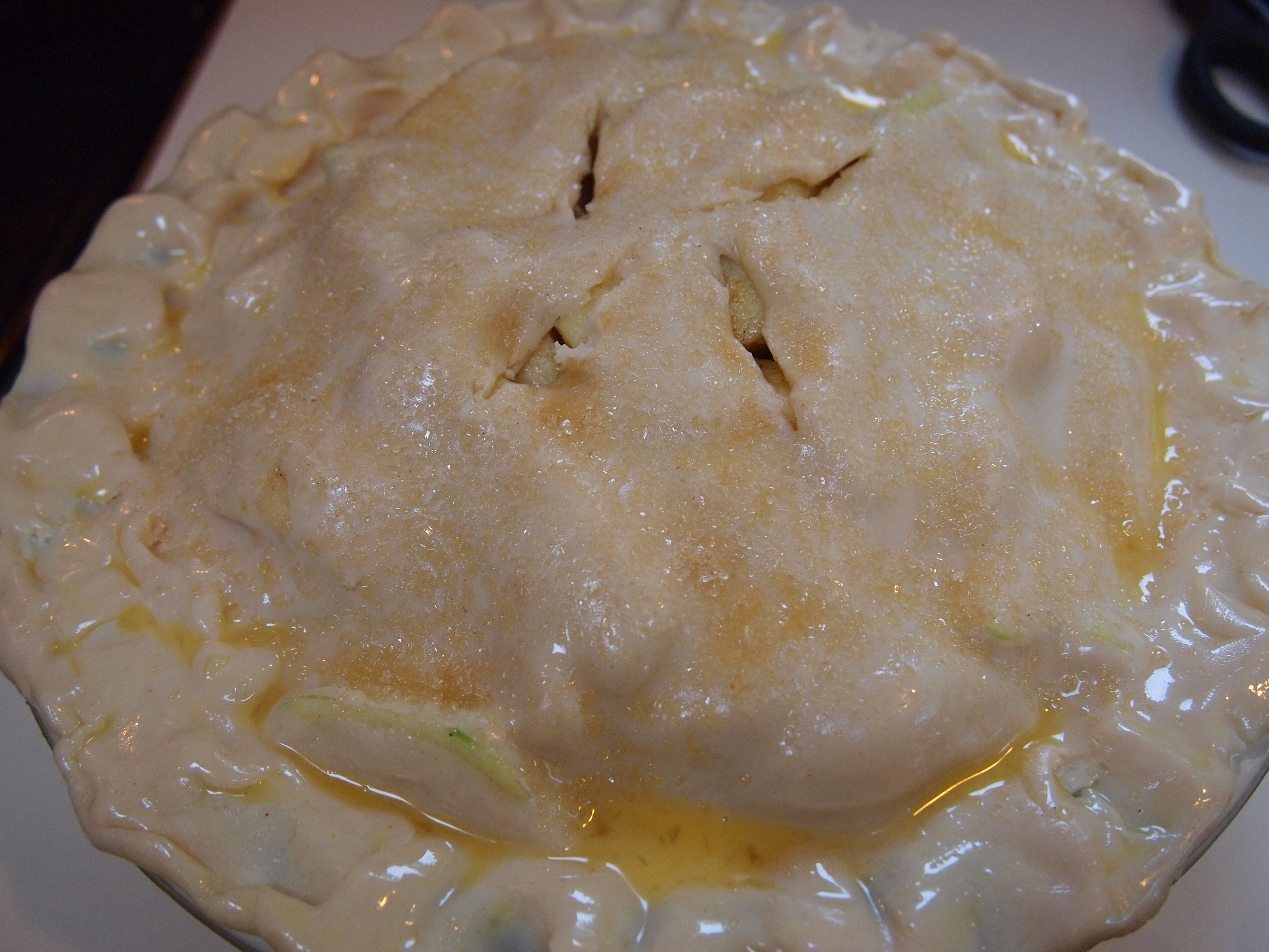 Brush the entire top crust with the egg wash, sprinkle with 1 teaspoon sugar, and cut 4 or 5 slits.