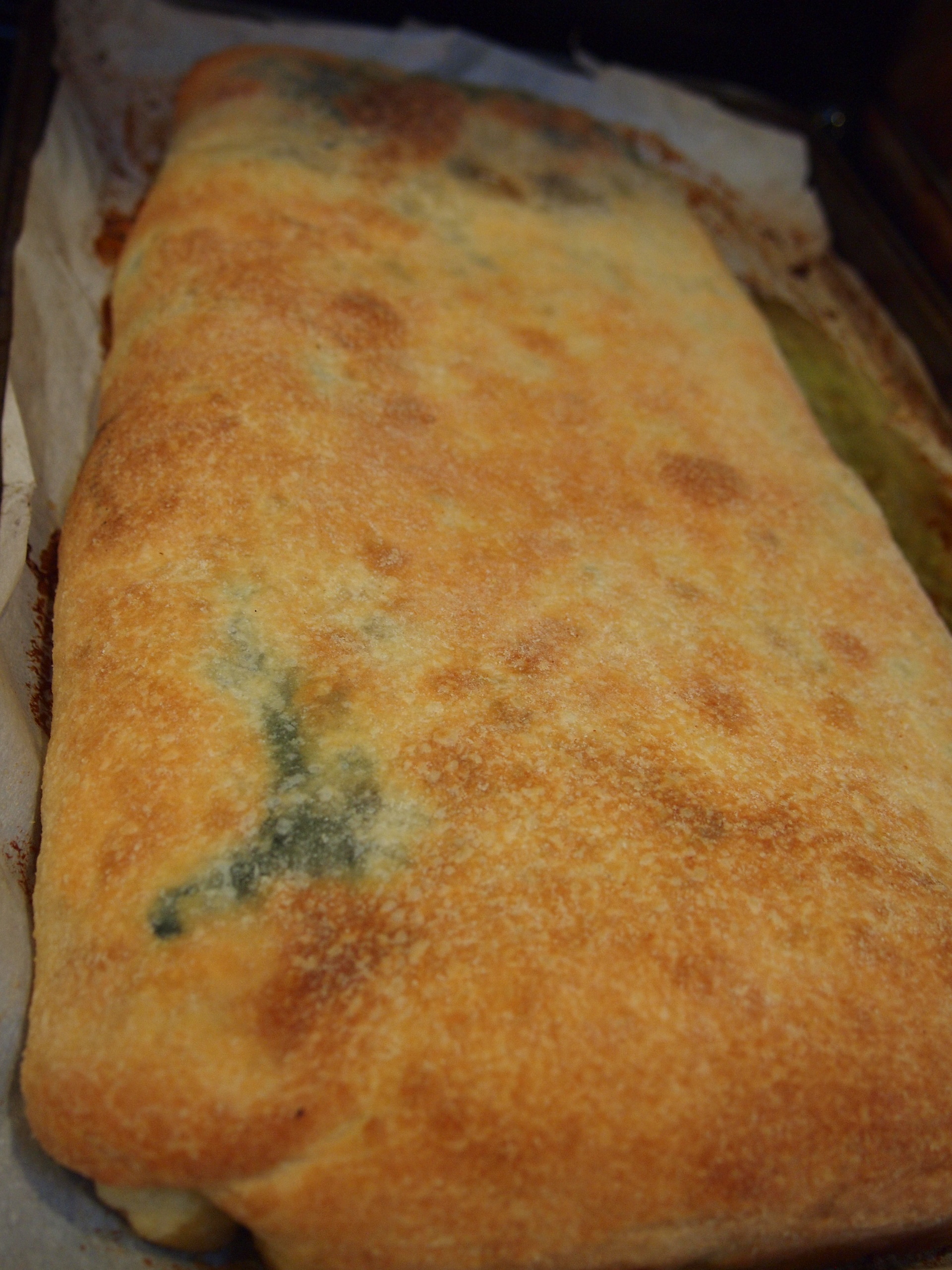 Fold the half of the dough over the top. Cinch along the seams, crimping where you just placed the oil as you close it. I like to tuck it under, as well as crimping it, shaping the calzone into an oblong shape, but you can leave it as a half circle.
