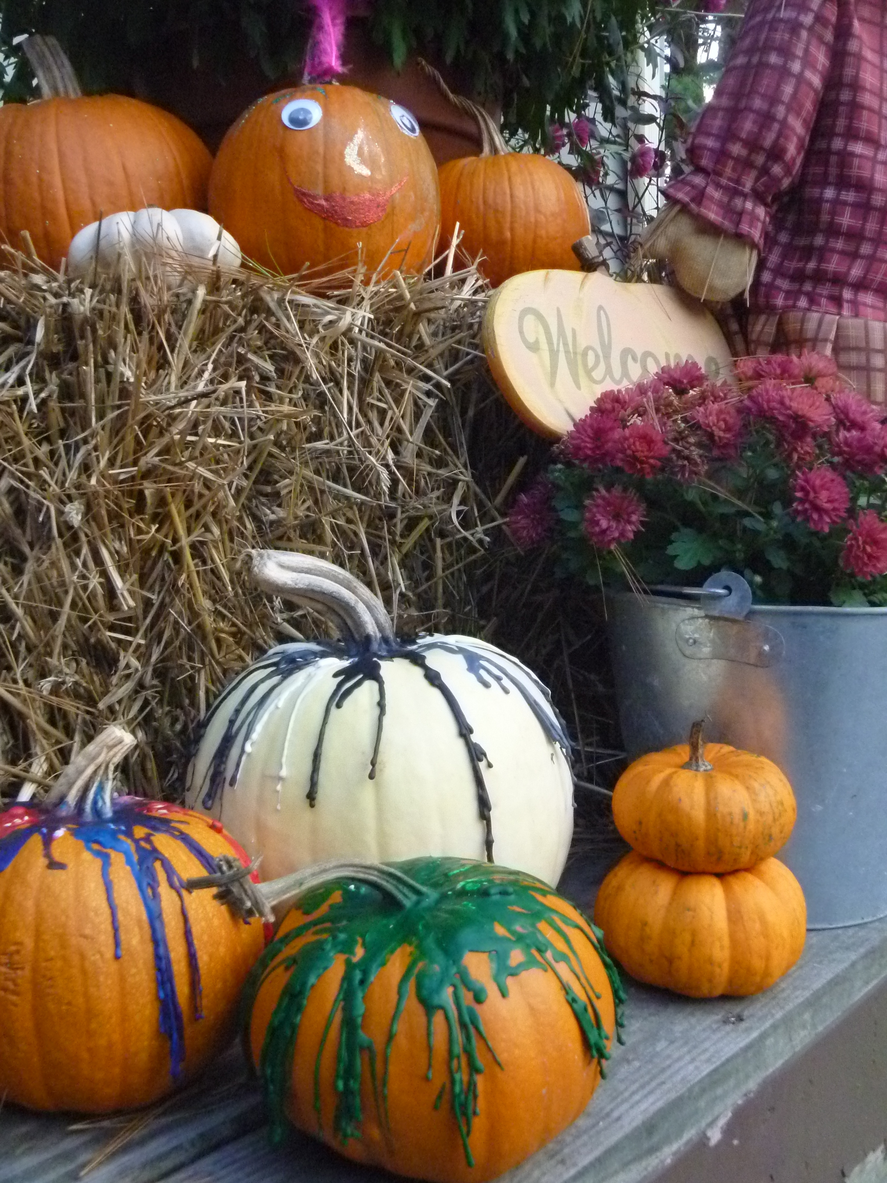 I snagged this pumpkin craft off of pinterest, as it seemed easy to do with the girls and a lot of fun; as I love making a mess! The one thing I switched out was the faux pumpkin for the real ones we already had from our trip to the farm last weekend.