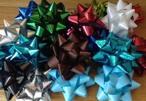 A bag of store bought bows are so not expensive, and much less after the holidays. That is the best time to go snag some bags. They come is so many varieties during that time that you can cover most celebrations, genders or ages with a bag or two. My favorite are the ones geared towards Hannukah. I love blue.