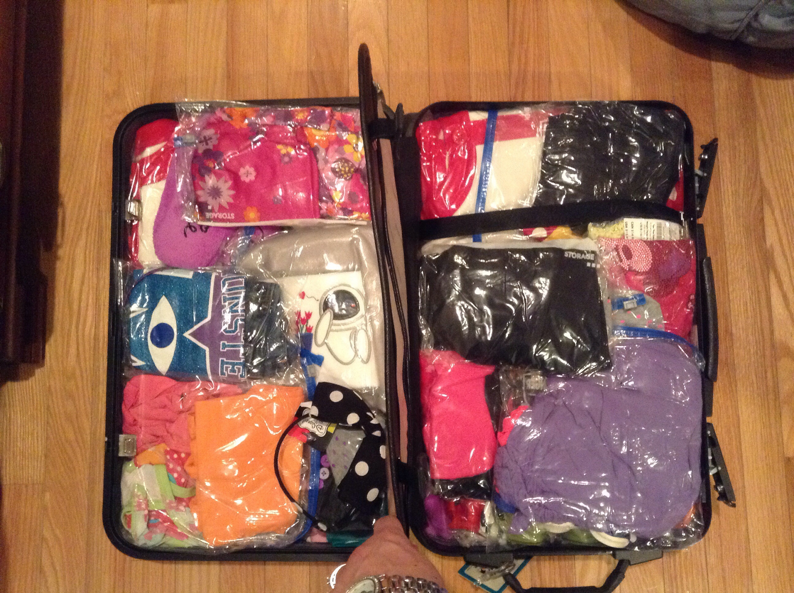 Packing our daughters’ entire luggage in storage bags makes getting ready in the room every morning easy, and a focused task for them (they can get distracted way too easily in the AM). A one gallon bag can hold an entire outfit, along with a pair of underwear, an undershirt, a pair of socks and a hair accessory; or a swimsuit, flip-flops, coverup and goggles! Fold the clothes to fit the bag. Add in the matching accessories. Squeeze out all the air before sealing it closed. Label the outside with who it’s for, and, voila! You have a complete, portable outfit for your child to put on without question after a shower..or much question that is! The bags are see through for easy grab and go for each day. Leave them as is in the luggage, or take them out, place in a drawer and… Done. You are unpacked. Then at the end of each day, all you have to do is place that outfit, which has been worn all day and dirty, back into that empty gallon bag, squeeze out the air, seal it up, and bam..dirty clothes are rolled compactly away for laundry back in the luggage.