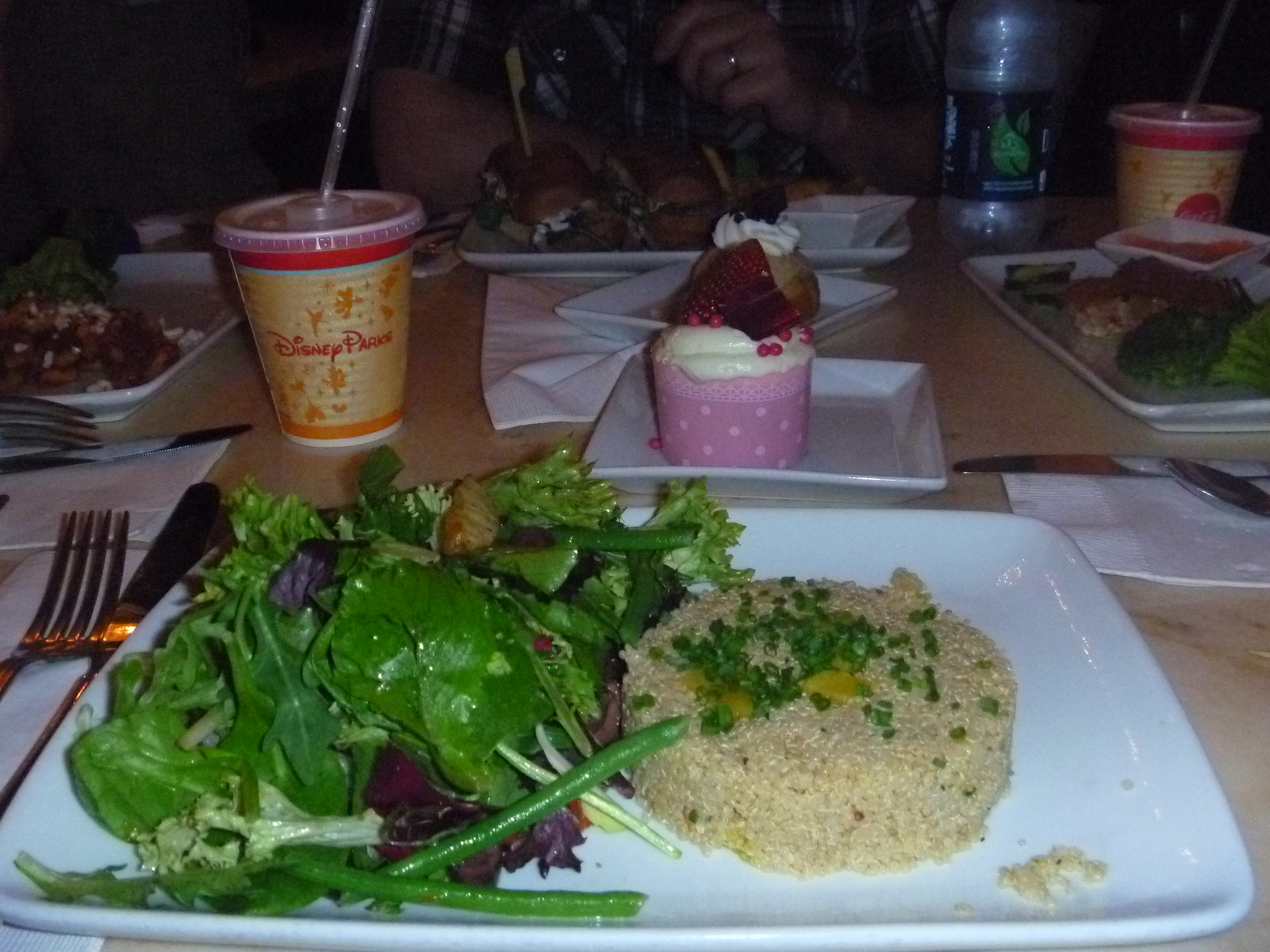 We dined here for lunch, quick service with seating inside. Though the wait was only 30 minutes, it was in the hot sun so that sorta stunk…but it was all redeemed inside as it was a real pleasant surprise. The atmosphere was pretty. We ate in the main dining room, at the far end near the windows of the animated falling snow. The staff was fun, and their method of serving the food through our magicband was genius…and the food we got ended up being pretty darn good. I am a sucker for quinoa! The two cupcakes, 1 strawberry cheesecake and 1 chocolate, we shared were pretty amazin’ too. The whole presentation of the place, food and service was a delight, and we were totally enchanted.