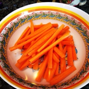 Cut carrots into sticks lengthwise; now, the sticks don’t have to be identical as that adds to the charm and rustic feel of this app.  Then submerge the cut carrots in the water bath.