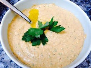 I like to serve with a bit of minced parsley on top and a side of warmed pita chips for dipping.