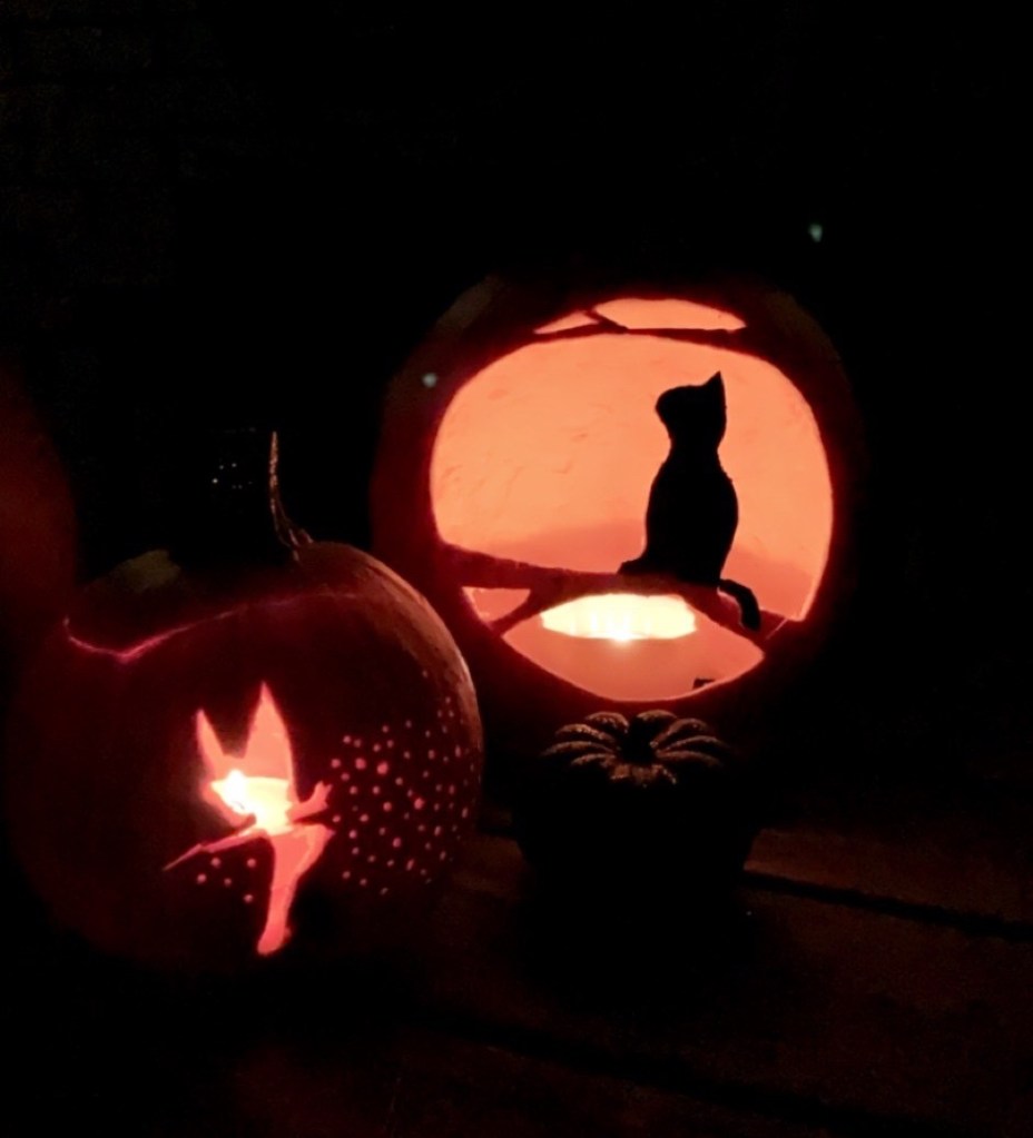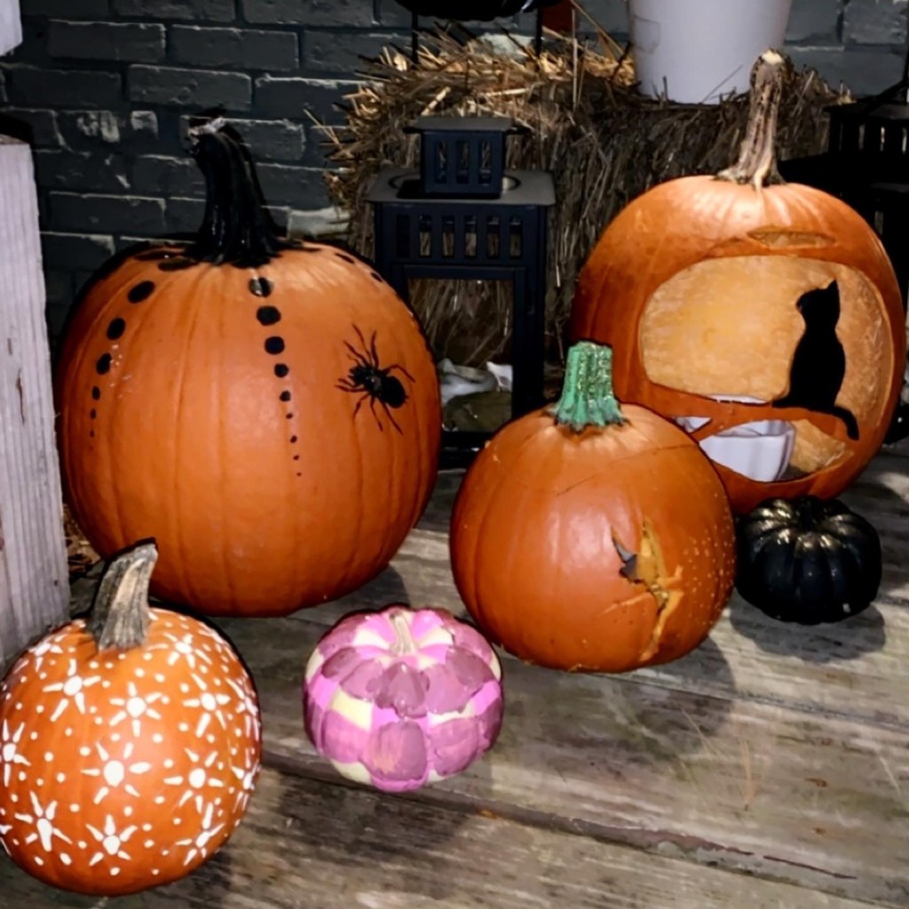 Our youngest painted her mini pumpkin black with glitter, and her sugar pumpkin was carved with Tinkerbell. She was happy to use the Dremel to make the pixie dust. Our oldest painted both her pumpkins- one buffalo check and one with flowers. Then I carved one pumpkin with a black cat with a moon and painted the other w a spider.
