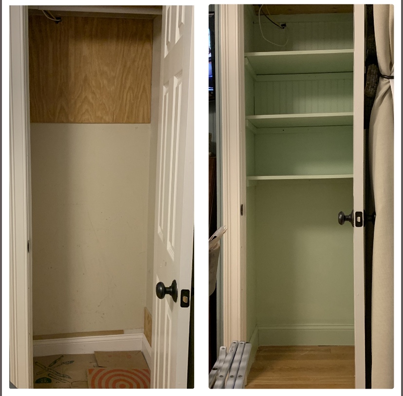 ✅ The closet in the TV room is done. The closet was filled with my husband’s old coats, an old Dyson, and lots of paper bags waiting to be up-cycled. Since it was built in 2007, we just used it for what we needed it for at the time and never changed it. I honestly don’t know why. So. This Friday during lunch break I emptied the closet; so many old coats! So many paper bags! Then on Saturday evening my husband and I got to work. Well, he did most of the work haha. Now I have a clean new spot for our everyday pantry items in there, and Jack’s cat food!