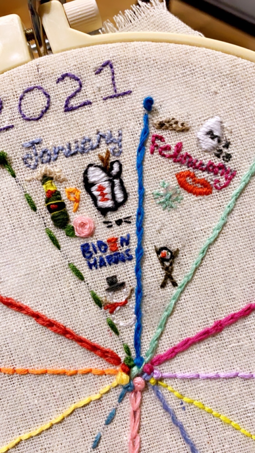 The journal is a different beast of a project compared to my other stuff. Since it’s ongoing I look at it a lot and am always thinking of what I am up to in order to stitch it on there. So I decided since I started it on a seven inch hoop, which isn’t terribly large, I will stitch major happenings or memories I want to recall instead of a daily stitch journal. Which I think works better.