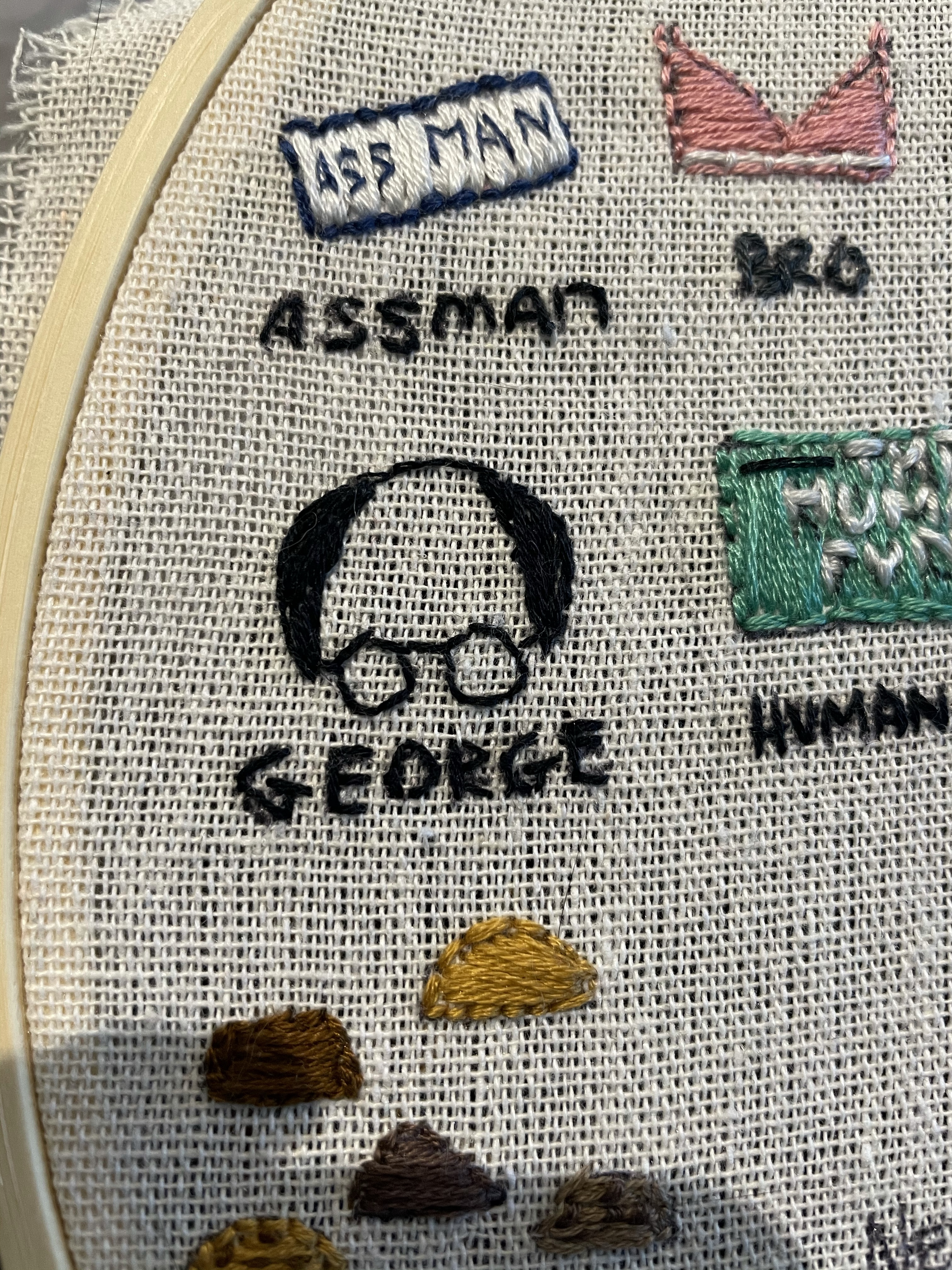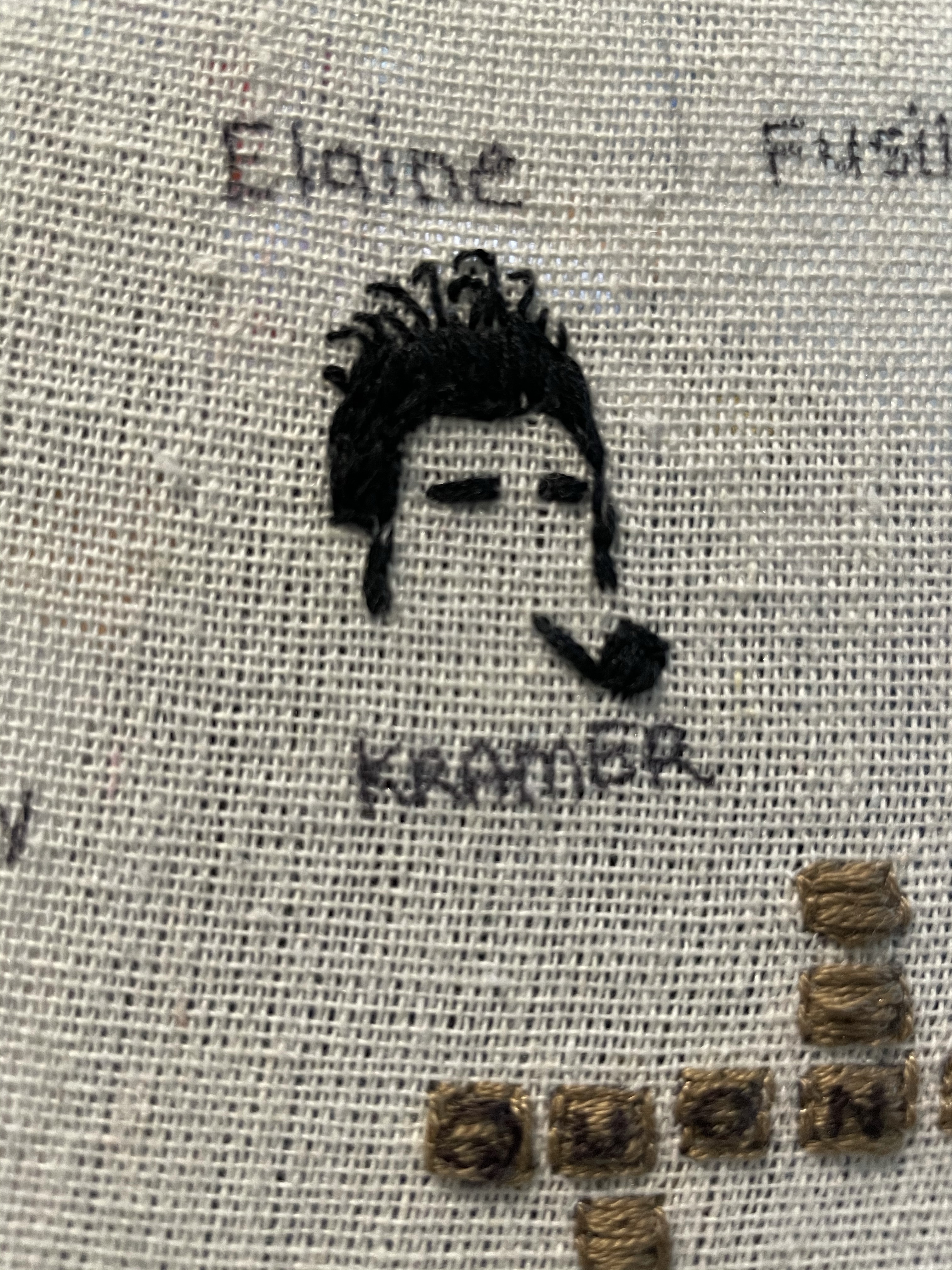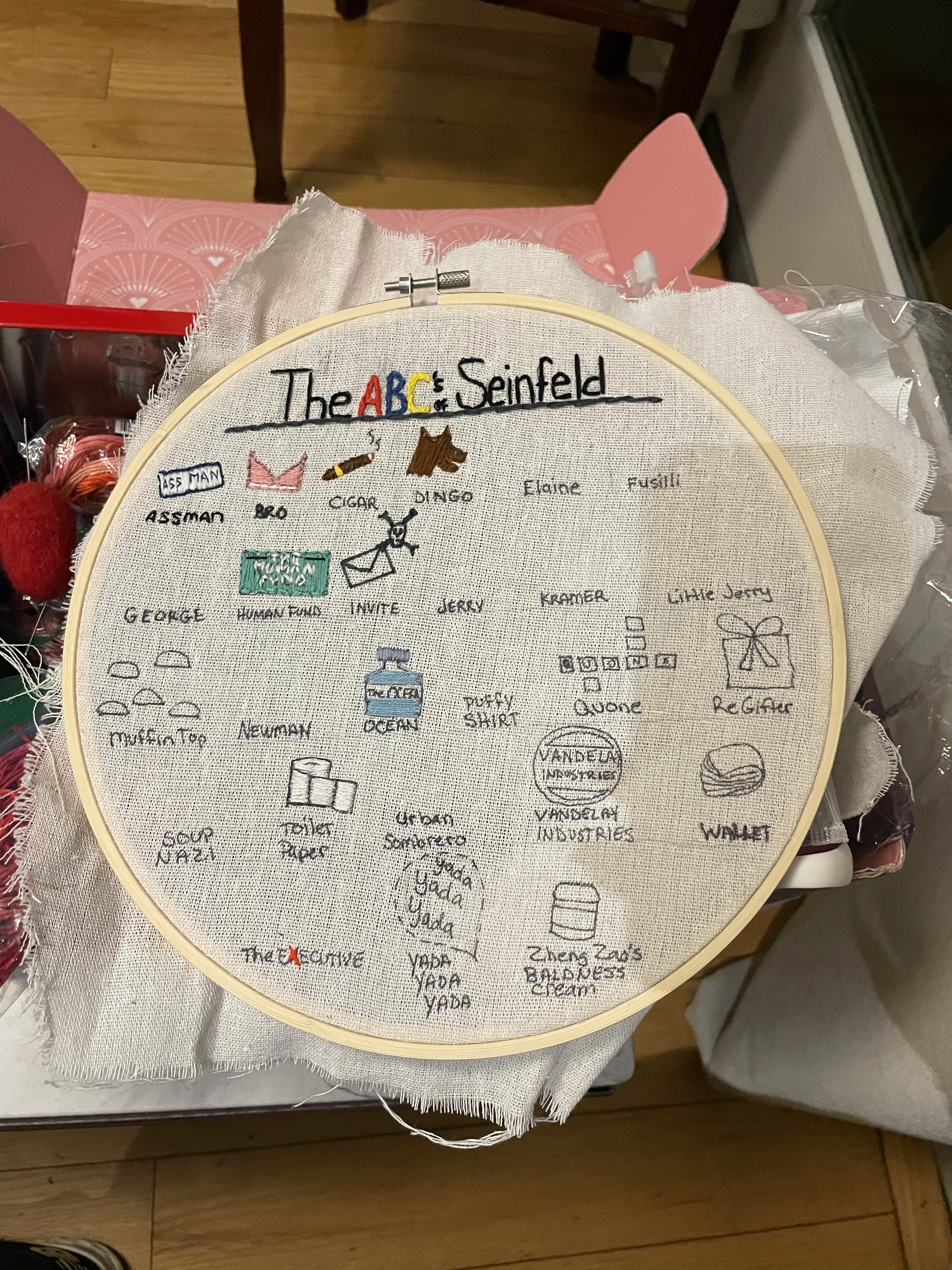 Then by Thursday, I was ready to get back to sewing something. I didn’t have a ton of fabric left since I trashed a lot over Agatha. I decided to use the remaining fabric to make something fun on my largest hoop, a 10”. As I loved making Wanda, a character, I thought about what other characters I could make. Then boom, thought of the greatest show to ever exist… SEINFELD. I’m a Seinfeld nut. I found a fun poster online that I could use called the ABC’s of Seinfeld. It is a funny visual dictionary of their greatest characters or moments.