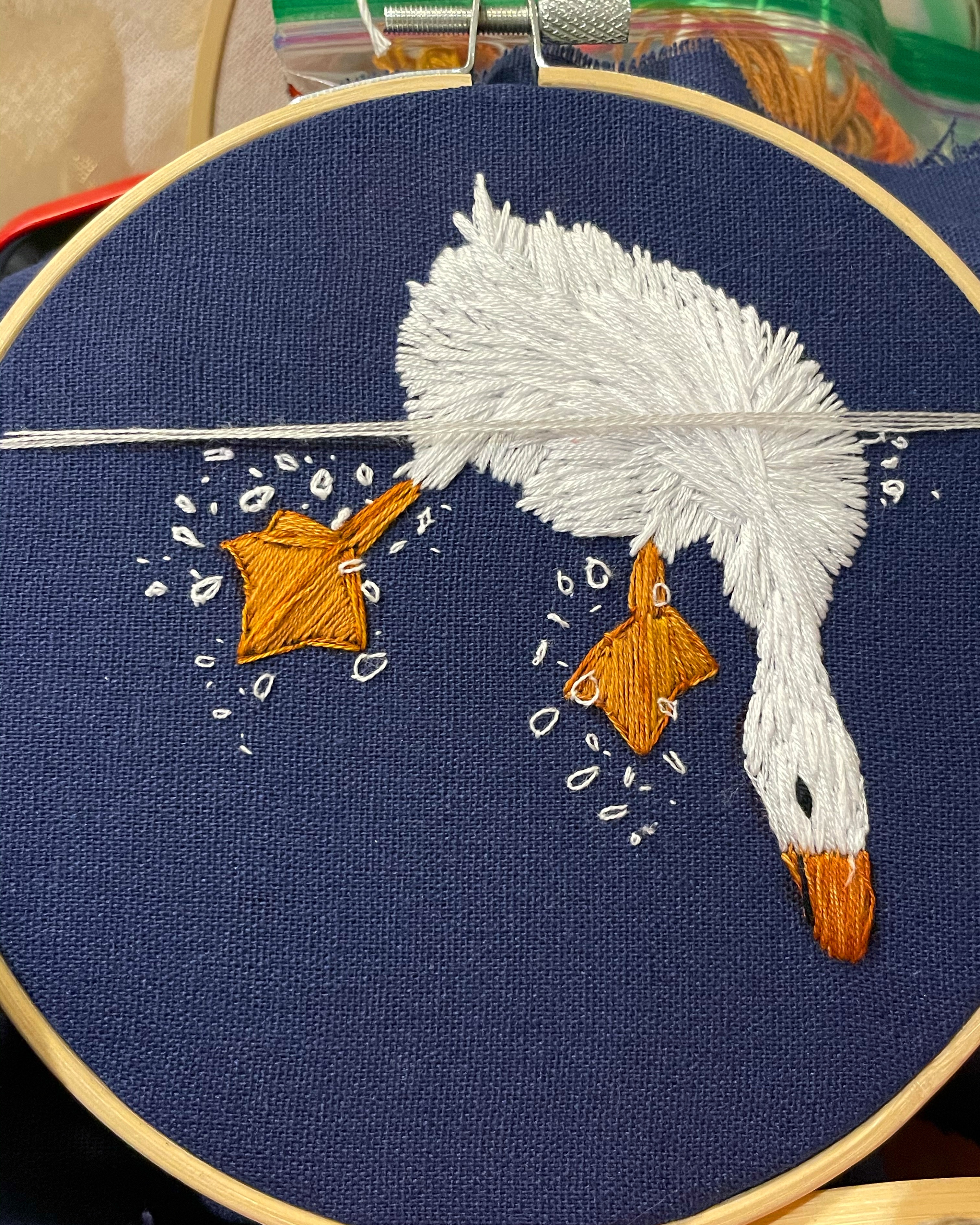I am actually pretty proud of my duck stitch. He came out so cute and feathery-like. (Don’t mind the bubbles, I was having such a tough time keeping focus with those.) It was my first embroidery using dark material, and my first embroidery using the material as a feature, ie, it’s the dark sky and water.