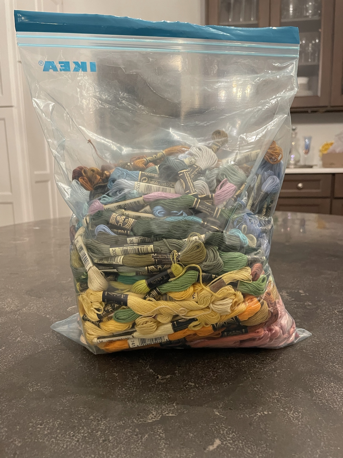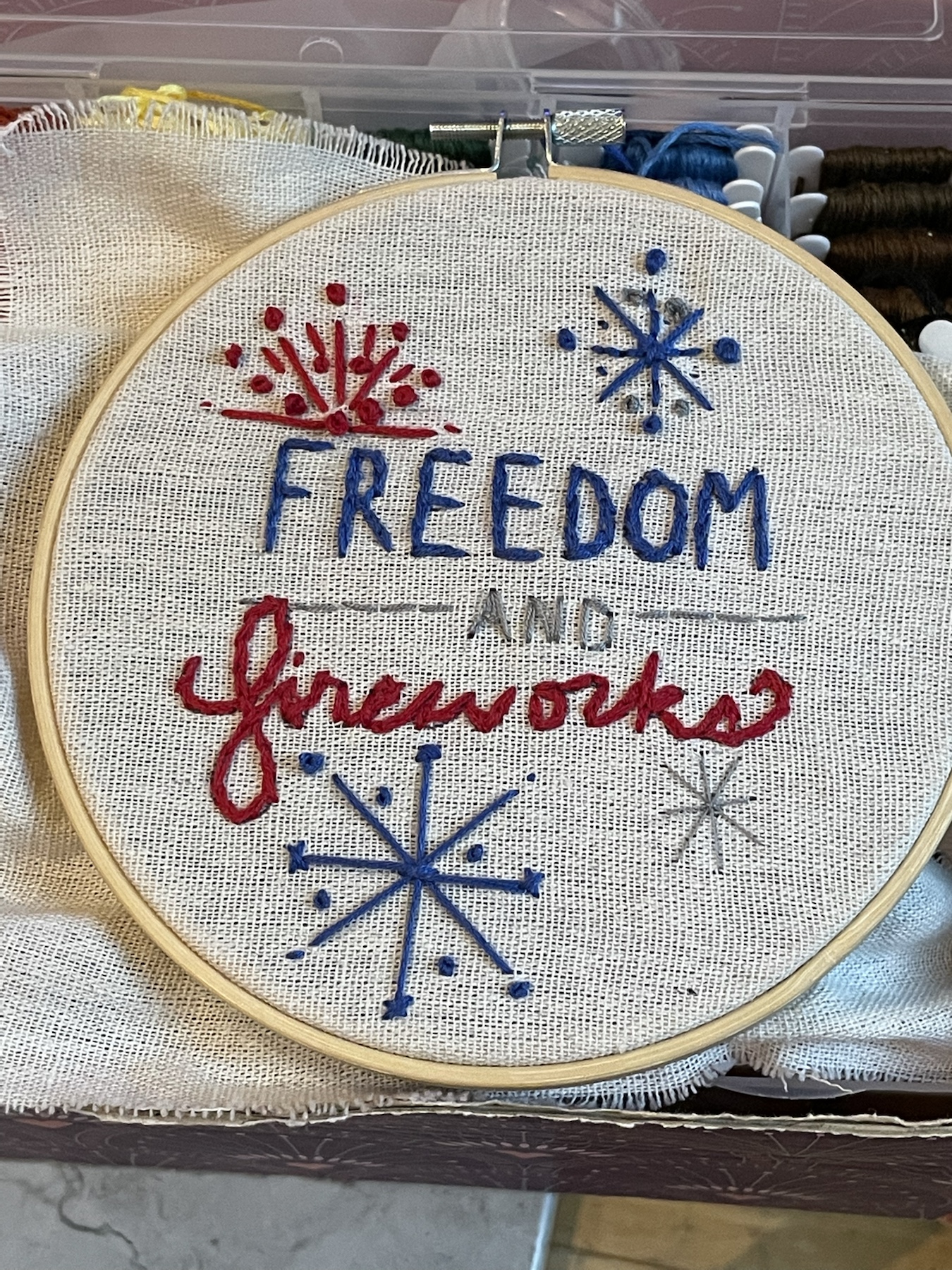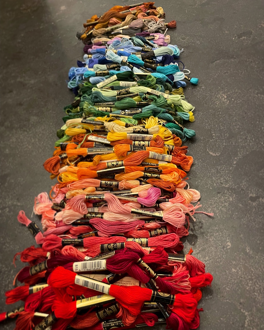 On the embroidery frontβ¦ As you saw, that Fourth embroidery is all I have done lately. I just feel so blah with this grey weather and havenβt been channeling it like I should into being creative. That and itβs Summer, so my brain has gone on vacation. But then my husband walked in from work this week with this huge bag of thread.