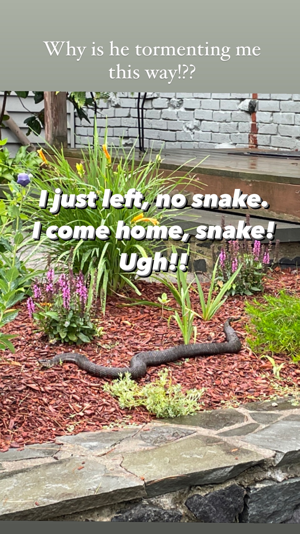 Ever since I spotted it outside, I wake up every morning eager to search for this jerk on my front yard from the front window. When I spot it, I cringe about it for the rest of my day. If I donβt see it, I am happy β¦till I look outside later and it is coiled in my plants. π I may have to burn my house down.