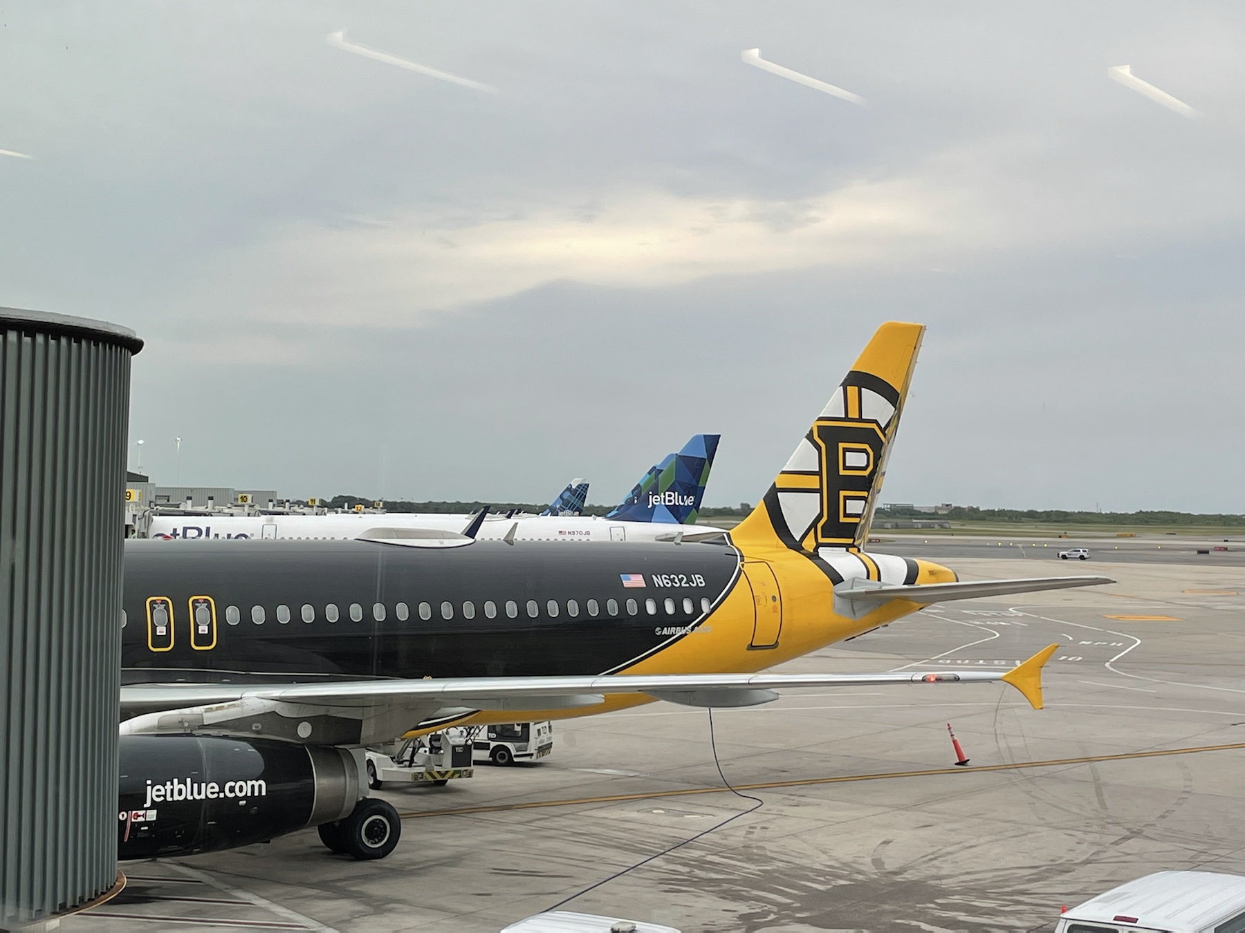 The flight to JFK was actually my first flight ever to NYC. I have always driven to NY, because I grew up driving there and part of the fun for me is the stops along the way. Our plan was to arrive to JFK airport, eat dinner and jump on our flight to Reno happy and full. Our reality, however, yeah when we got to NY we ate, which was a lot of fun. Once we got to our gate we saw the plane we were taking, it was the Jet Blue Boston Bruins ‘Bear Force One’.