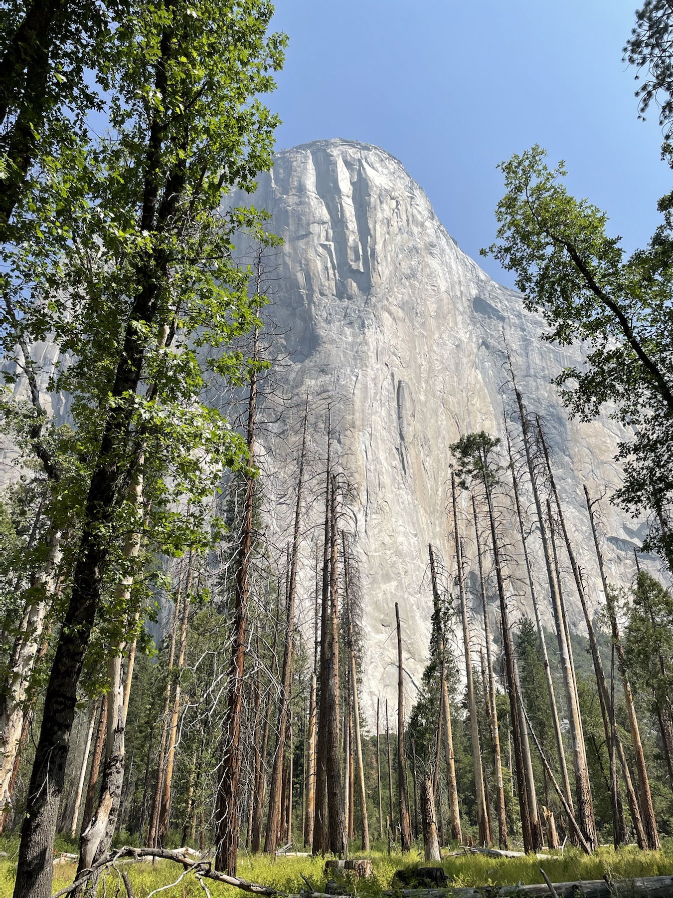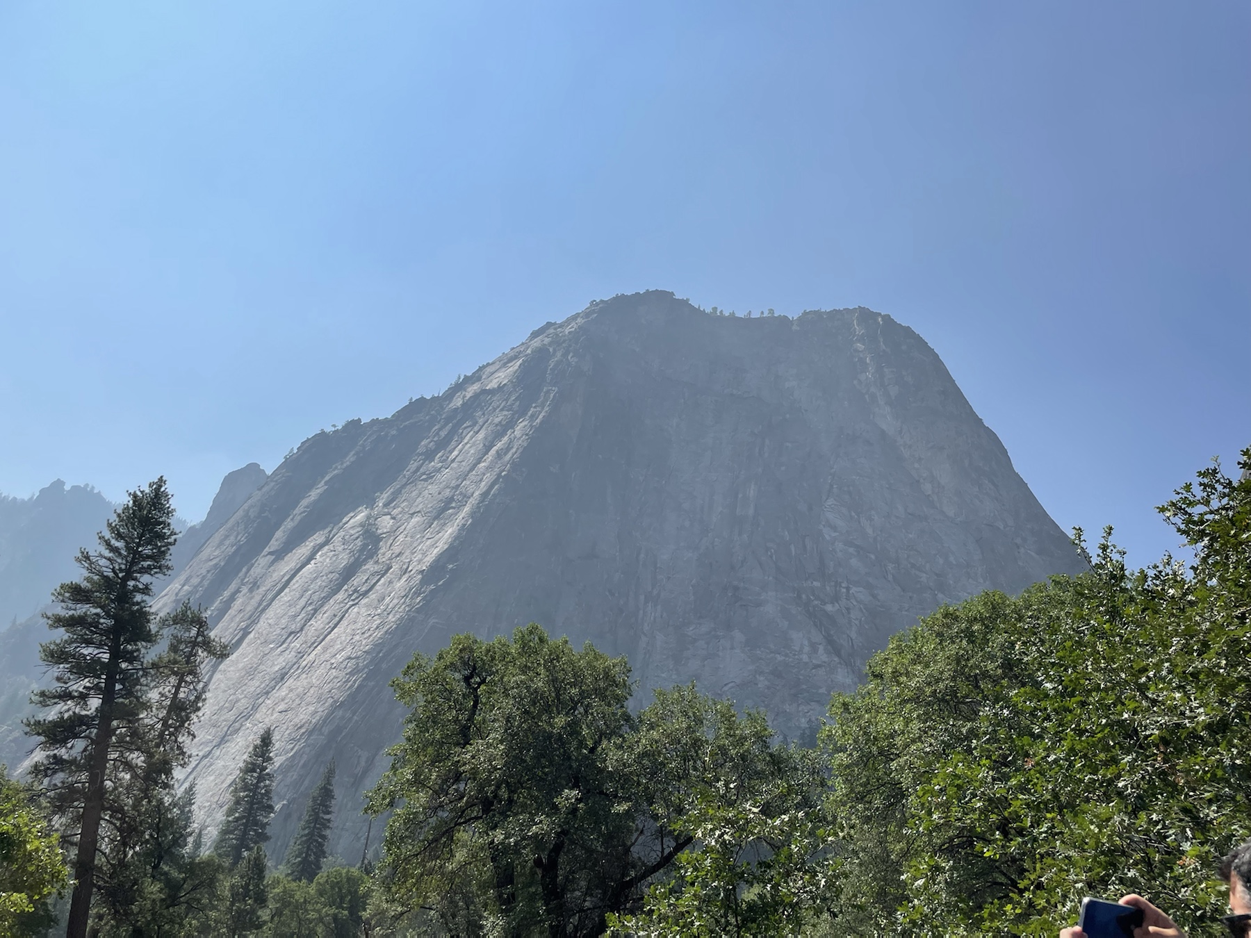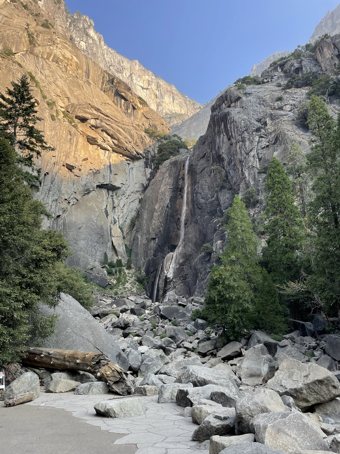 From our lodge, more so our rooms, the Yosemite Falls Trail was about a minute walk across the street, and boy what an entrance view. Yosemite Falls is North America’s tallest waterfall at 320ft. The views walking through the parking lot were impressive. (The night before walking this path in the pitch dark was definitely scary. If I had known what was ahead of us, I’d probably would’ve toughened up. haha…). We took our time admiring the falls, listening to nature and taking pictures. There were, maybe, a handful of people around the area with us, so it felt private. The Falls were not as full gushing because it is Summer. Walking a hundred feet or so from the start of the path, over a hill, we came upon the ridge over the Yosemite Creek that the falls spill into. Gorgeous, but the water was at a trickle because of the lack of rain. The rocks in the space were enormous however, and we watched a photographer risking his life for the perfect shots on top of the rocks. The rocks were so slippery, even without it being wet.