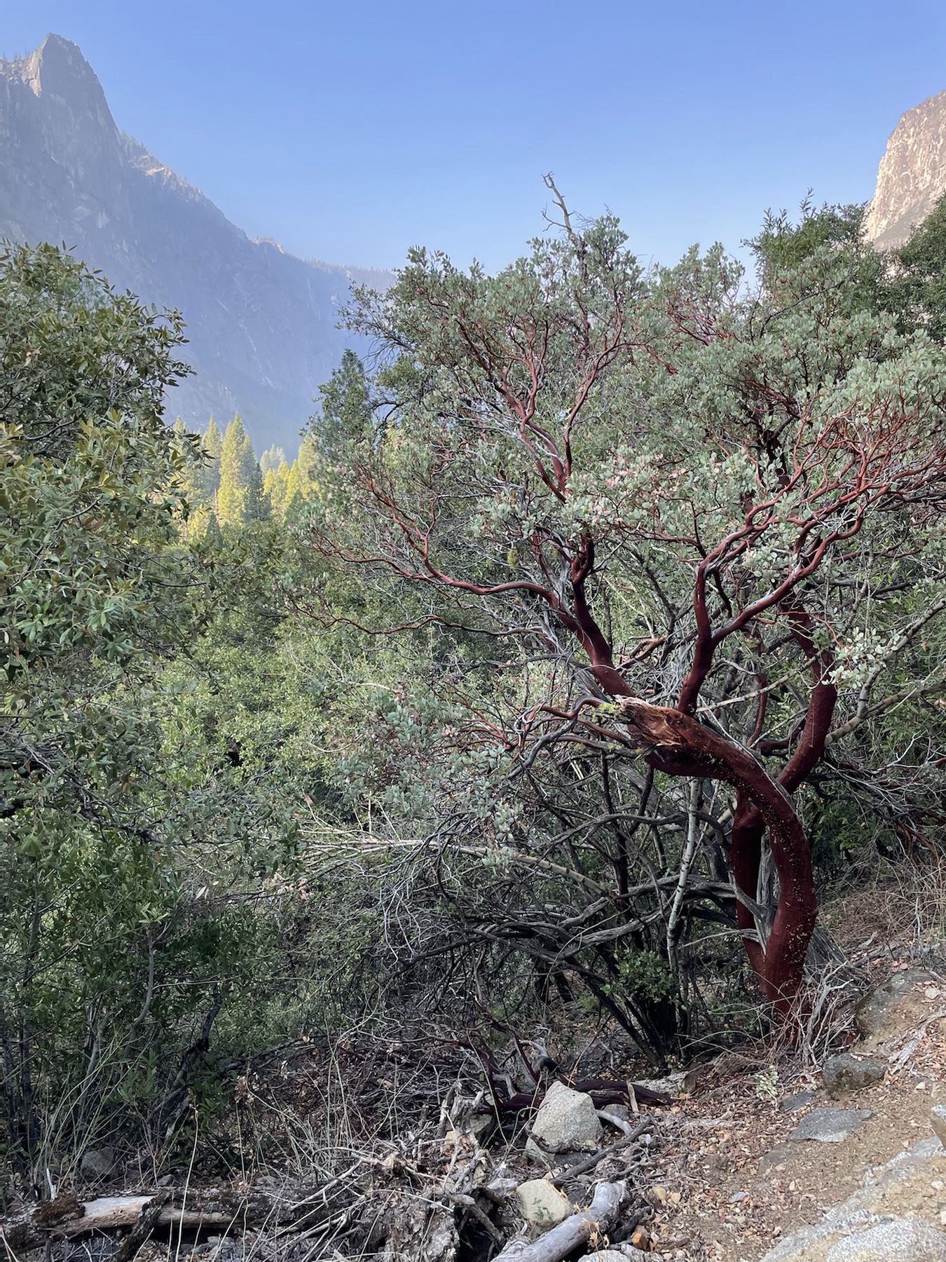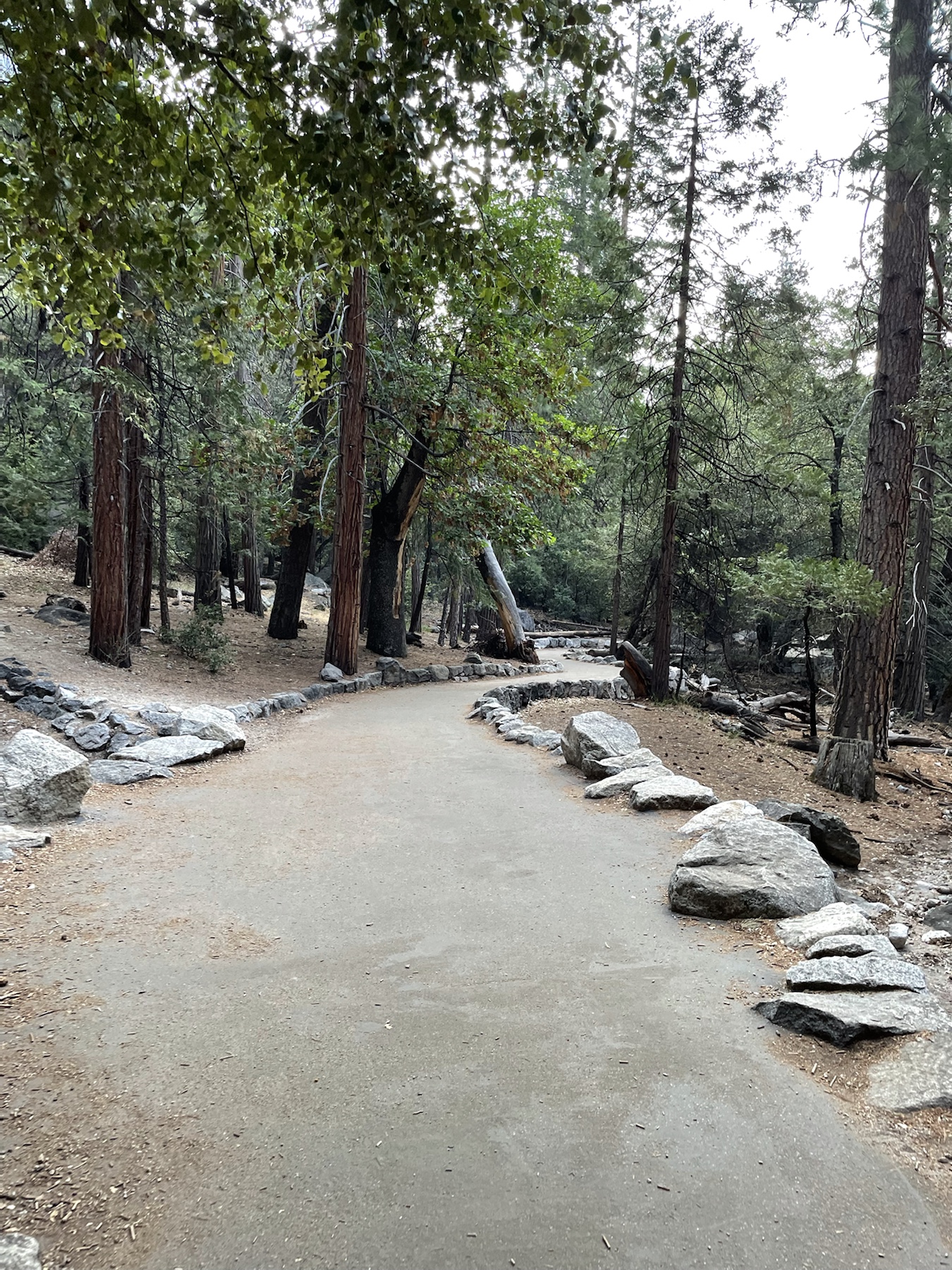 The trail follows along, very manicured and the paths are basically naturally paved (easy to walk). There are elevations up hills and whatnot, but definitely easy to make through for a person in any shape. There is a long decline at the end that spills out to the Church Bowl picnic area with the view of Ahwahnee Meadow, being hugged by the Half Dome and Glacier Point. Glorious.