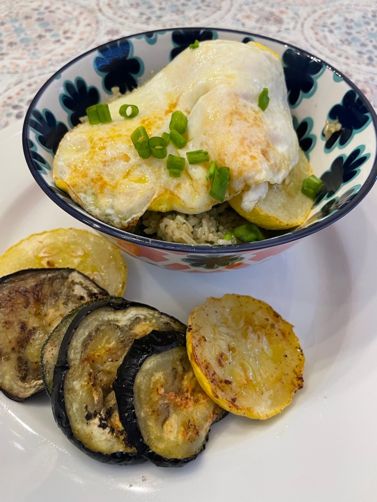 Made mushroom pesto rice bowls w veggies last night. That’s my eggplant with my neighbors squashes.