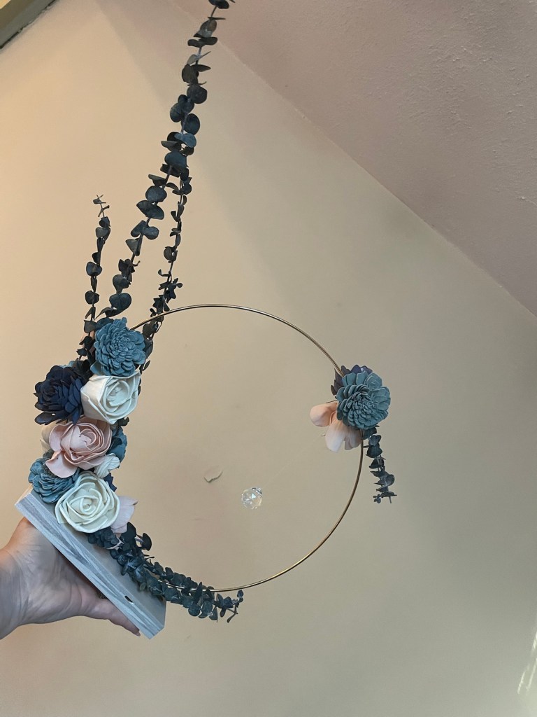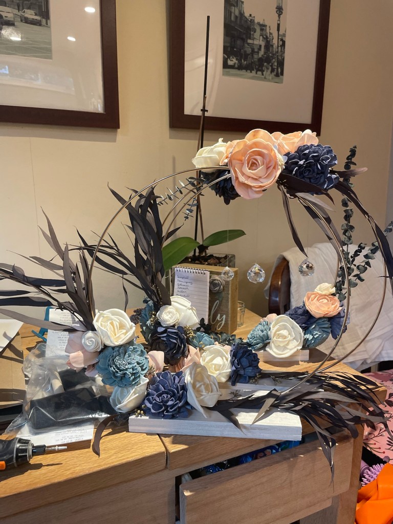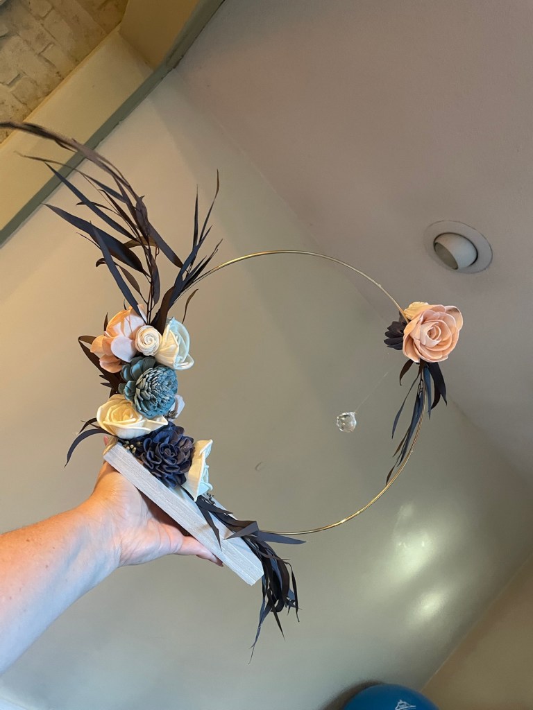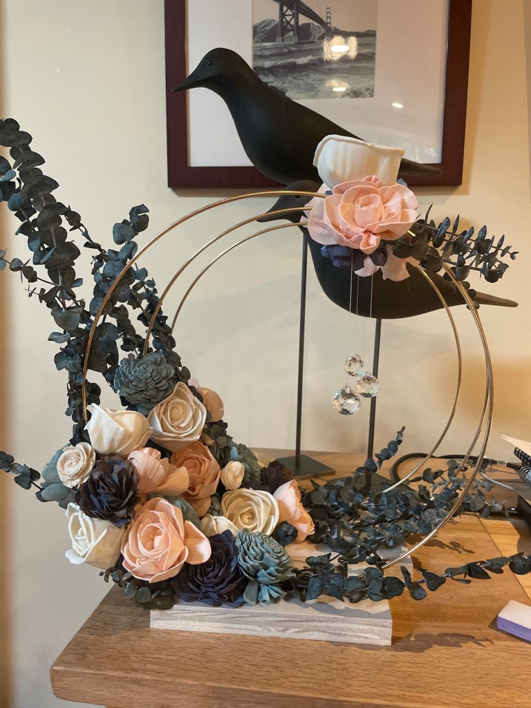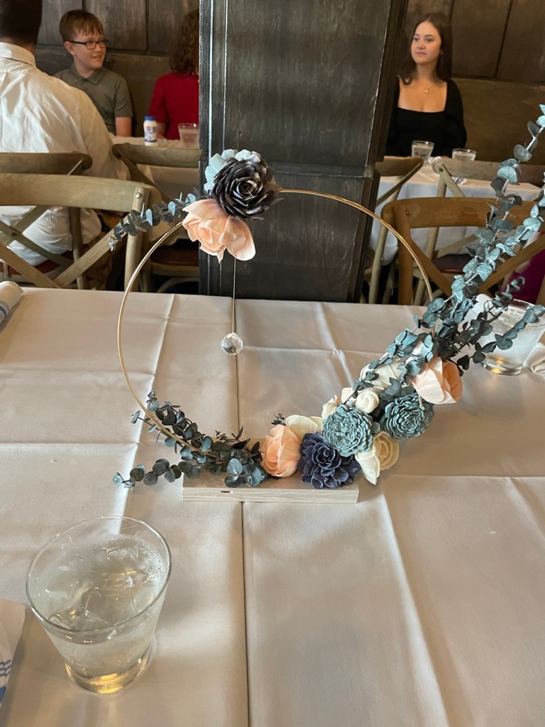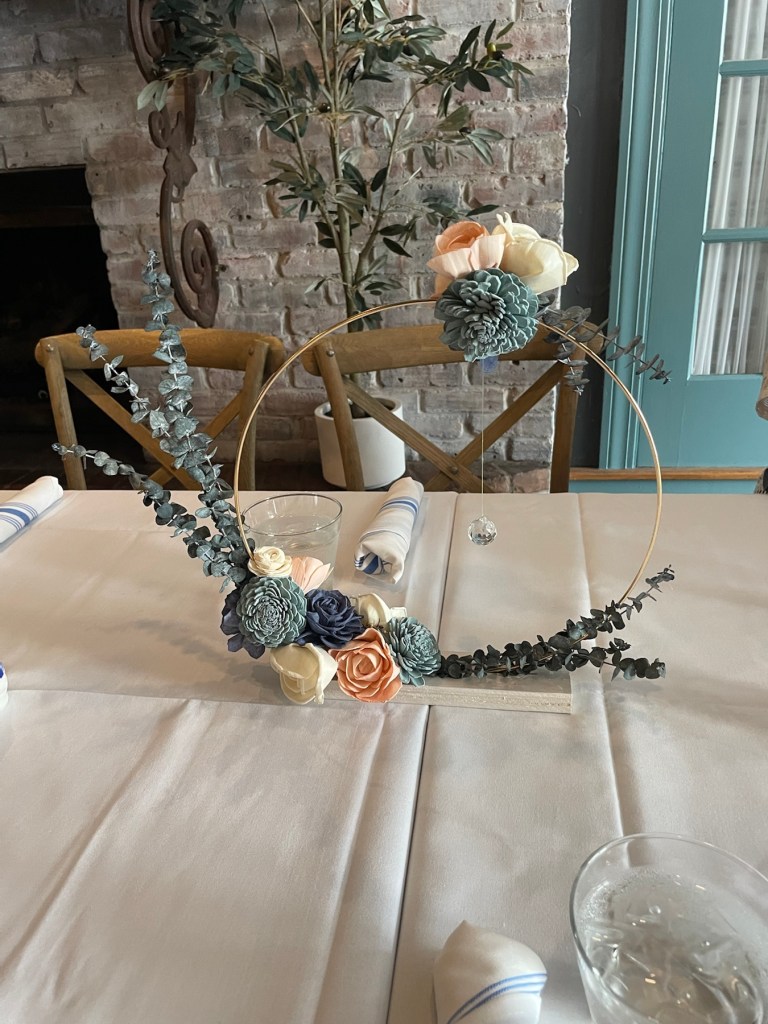 I truly love the shabby chic look. The style is vintage, and eclectic. It comforts me that I can mix and match media and materials to create fresh looking items that have a rustic feel. So for her party, I decided that I would forego a proper centerpiece of flowers and created two different styles, but similar centerpieces. I made 8 centerpieces all together; 4 of each look. The two centerpieces both start with gold floral hoops on a wood block base decorated with sola flowers and crystals; the defining colors were from the blue eucalyptus and maroon feathery leaves that were used. They turned out just as I wanted, which was a huge hit of the day.