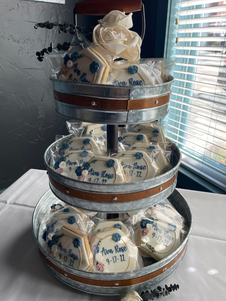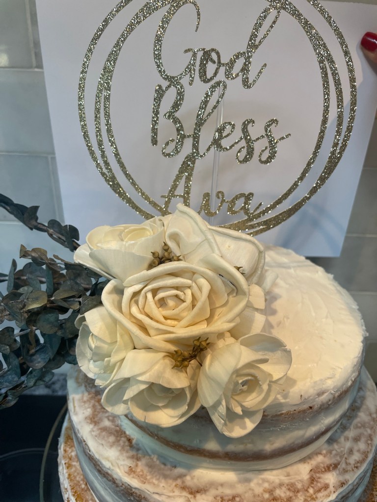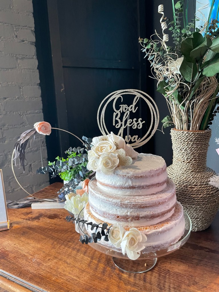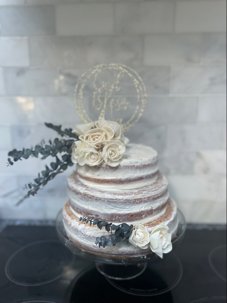 Our daughter requested a classic modern cake; the look of a naked cake (a partially frosted cake- where the ribs of cake are exposed on the sides). Very shabby chic! 😂
