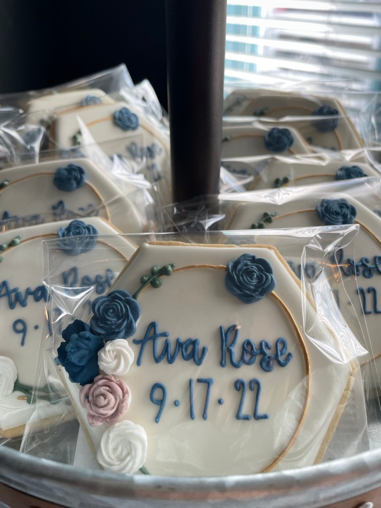 We planned for me to make the cake with out schedules- which freaked me out! I am NO baker. Nor decorator. I was nervous because this cake would have to feed 50 ppl, and after I did some research to figure out portion sizes, the cake would have to be three tiers. Multilevel, guys. I drafted out a look using the food safe flowers similar to the ones from the centerpieces and jumped in with both feet to create her cake.
