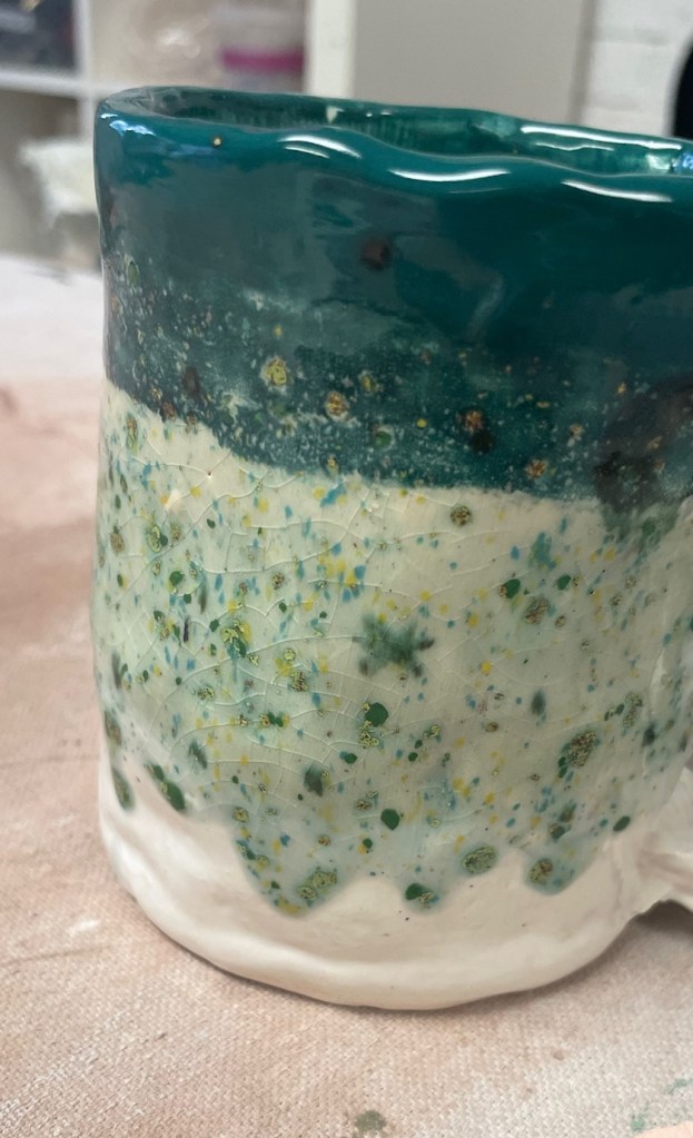 I was so happy to see my very first piece done! The mug is so horribly imperfect but I love it. The colors came out like I planned, a graduation of green to white. I understand glazing a bit more after talking with the class guide-it’s tricky.