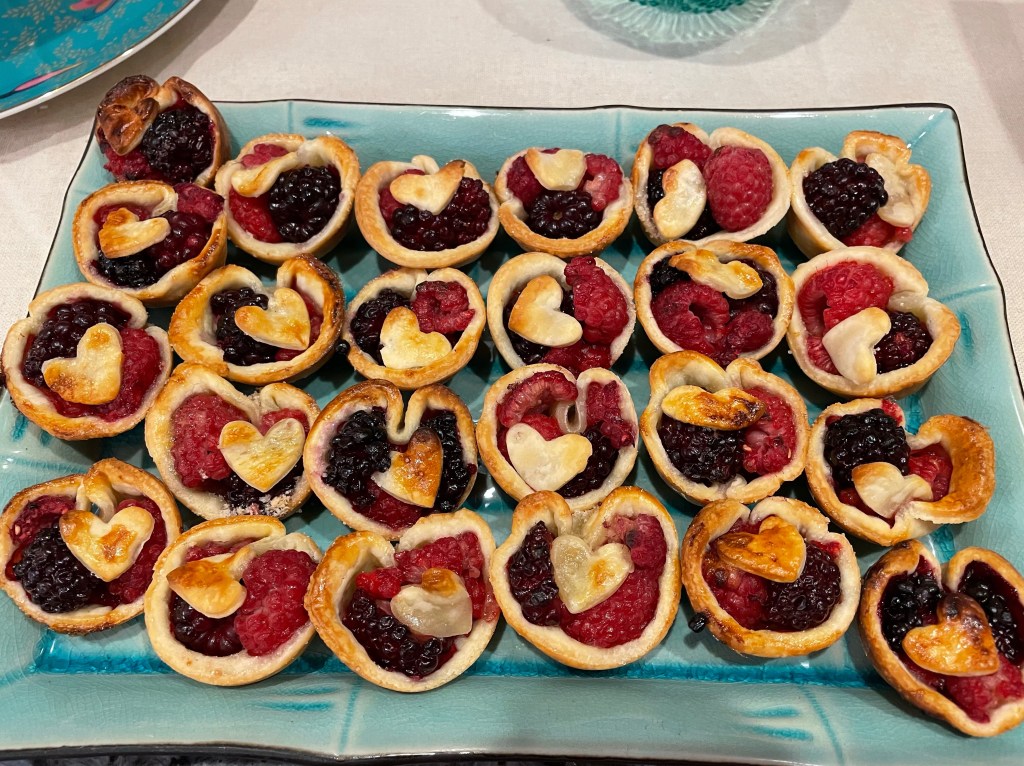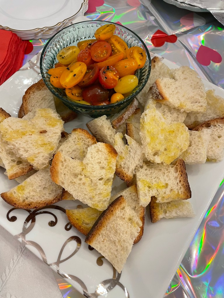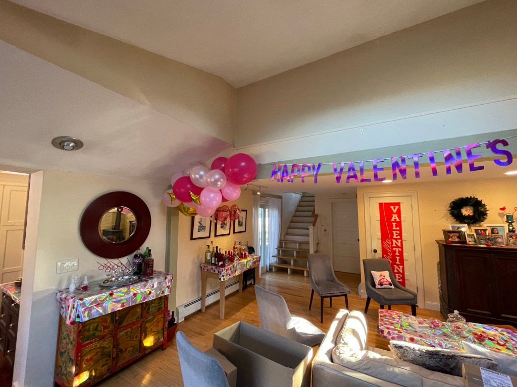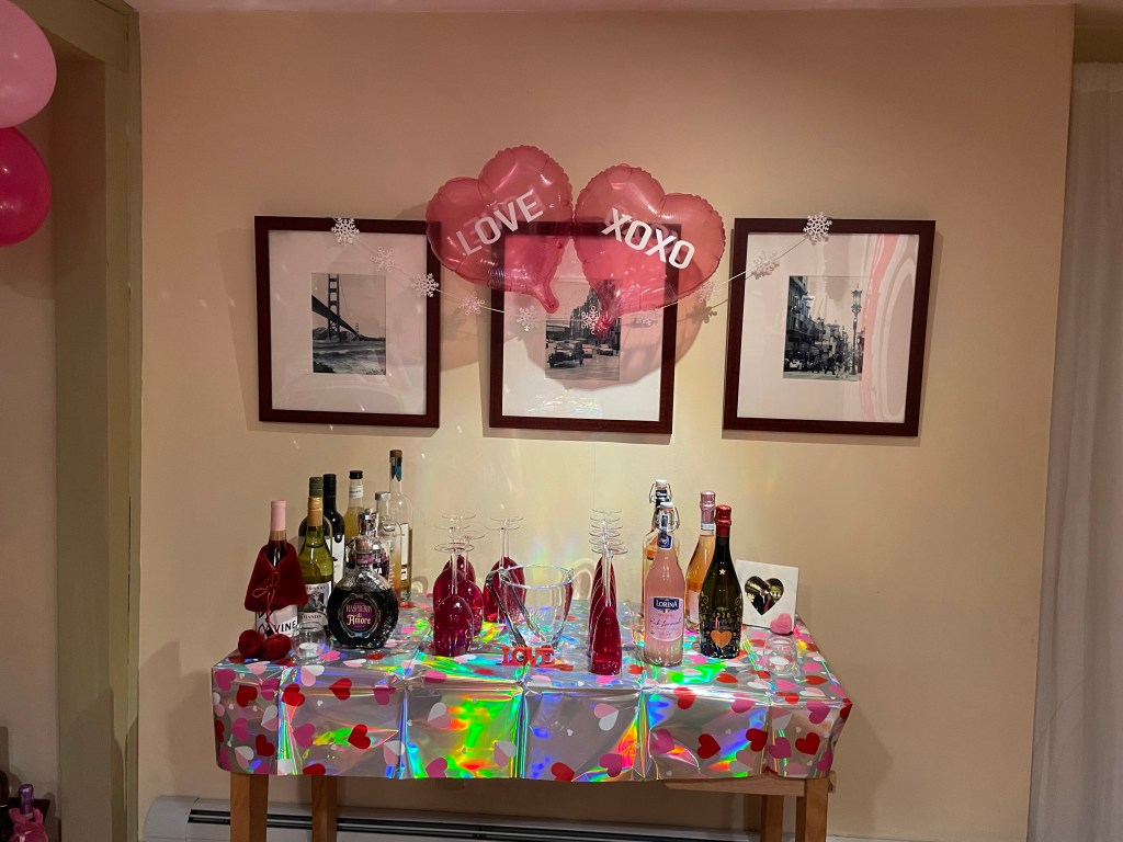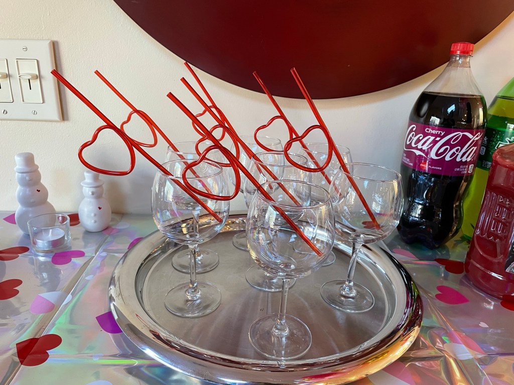 Every room in the house was heart studded in pink and red. So pretty. I planned on making heart-shaped apps and desserts, then to have my husband shake valentine themed drinks. It worked out great. We even set up a mocktail station for our non-drinkers and the young adults.