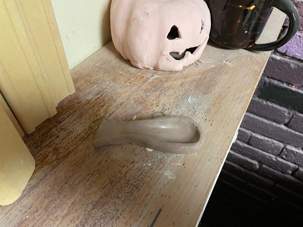 The bowl is below in my gallery -it is left drying on the shelf near my fish shaped spoon. They both have to be sanded then glazed next week. Our last day of this session.