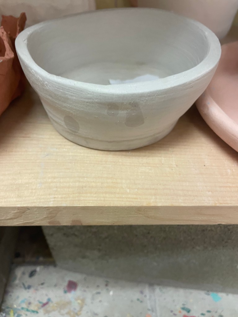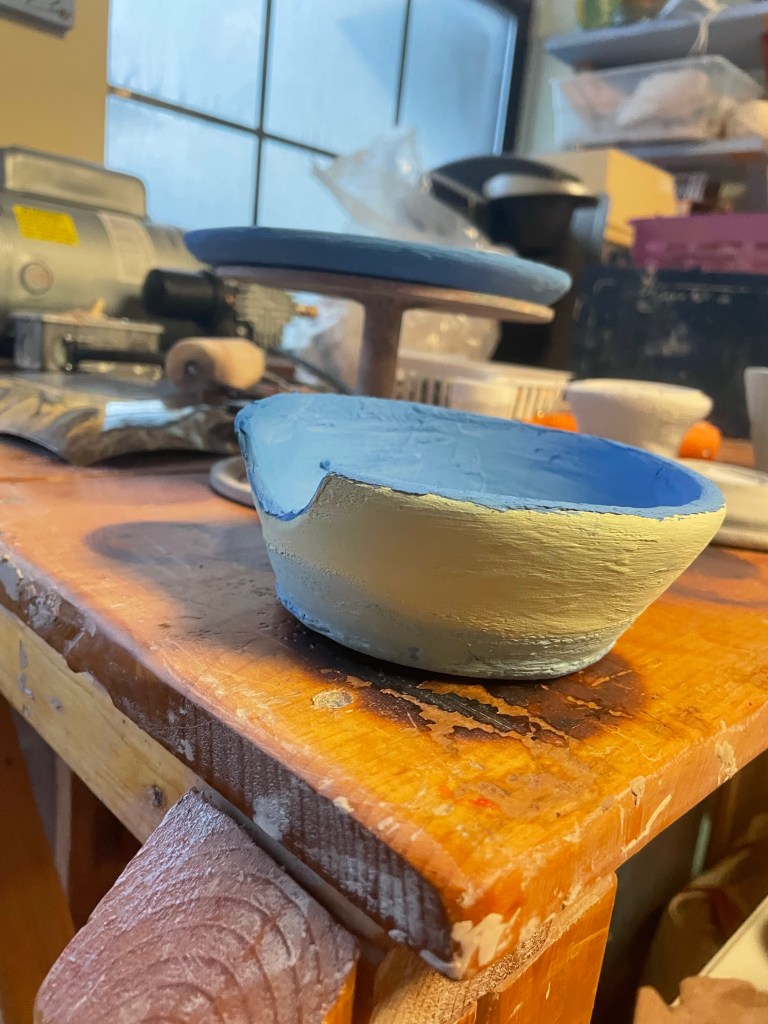 Unfortunately, I ended up chipping one of my bowls, from holding it tight while sanding it. Instead of getting discouraged and tossing it in the mud recycle bucket, I decided to turn my mistake into something functional. A dip bowl to use with a spoon. It’s a pretty big chip so it seemed logical. On top of this mishap, the plate that I made three weeks ago started to fracture after the first layer of underglaze. The class assistants said it could be saved during firing but it didn’t make the run in the kiln last weekend. So it’s waiting for this week. Crossing fingers!!