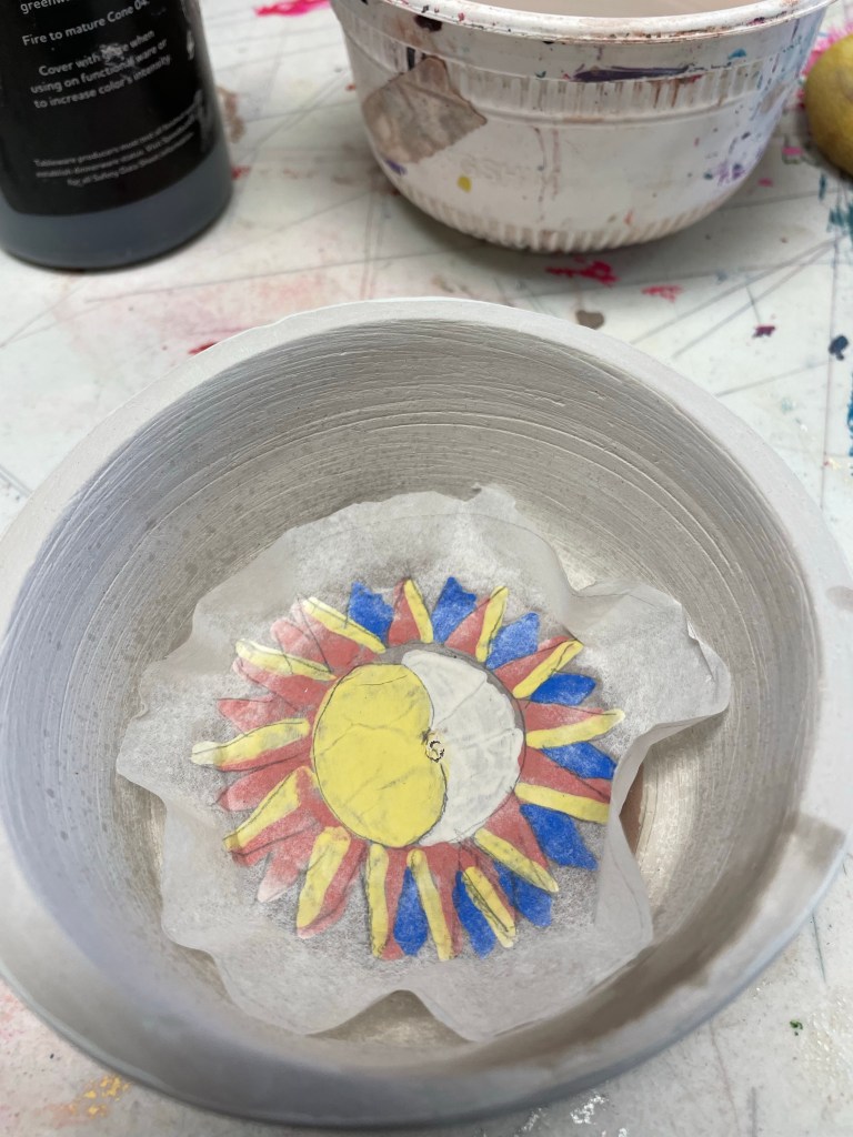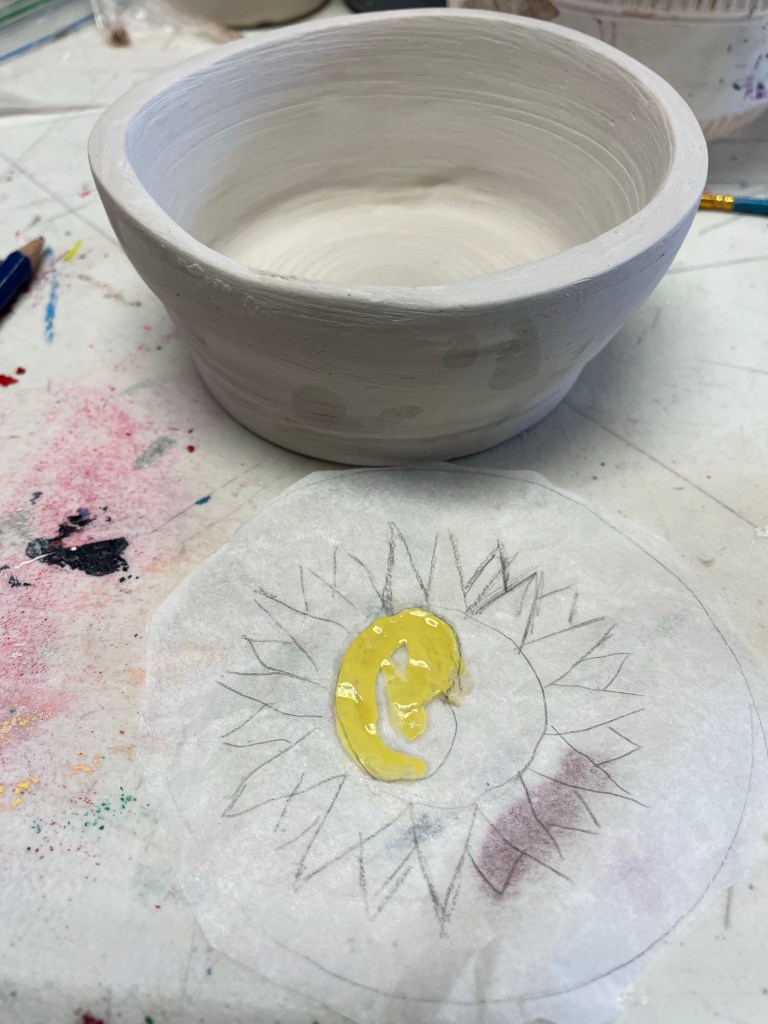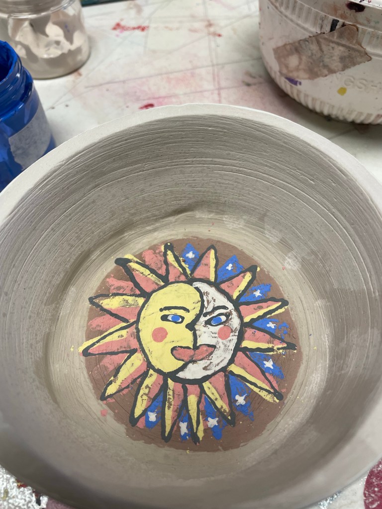 Then class started. We learned how to make glaze and slip patterned transfers. This was such a cool technique! I decided to make a hand-drawn moon and sun design, but stencils were available. I just didn’t see a pattern I liked, so to the internets for an idea I went.