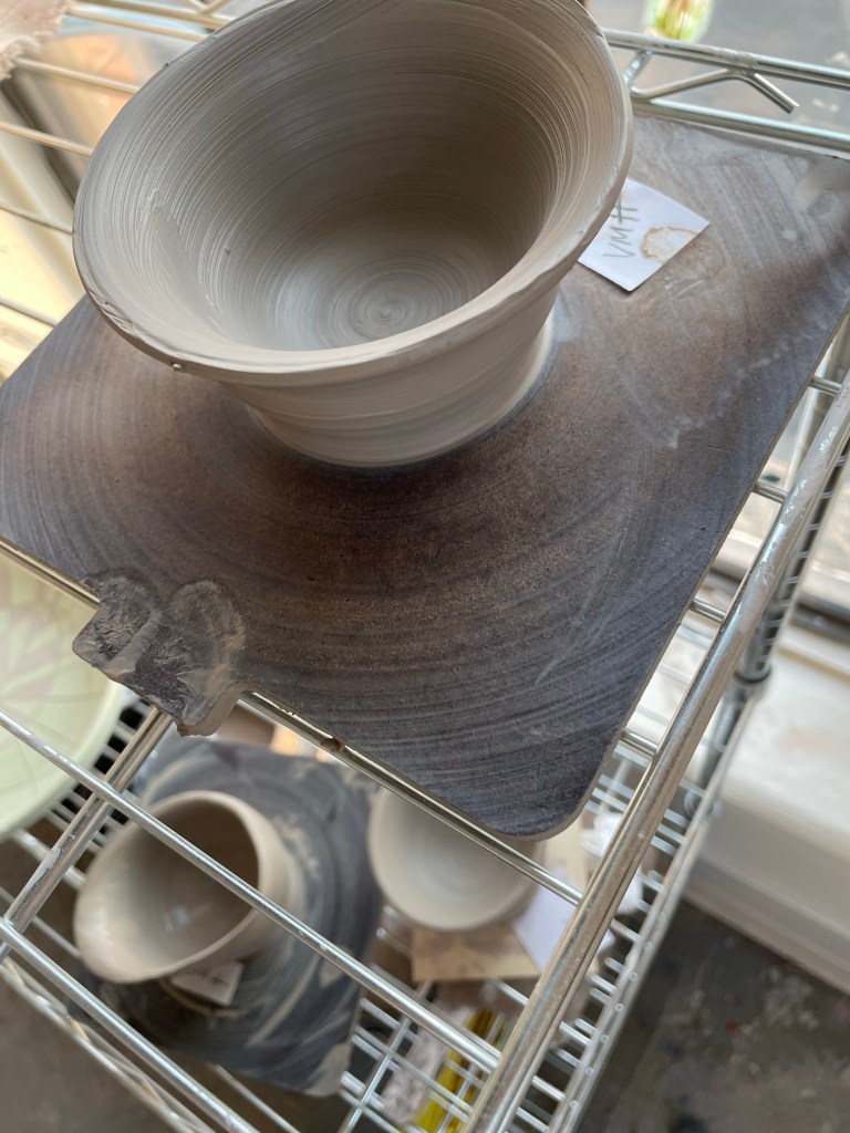 I got to class early, I am putting it out there that I always go to class early nowadays. Actually, lately, most of my classmates end up coming in early too. See? Trendsetter 😂. Anyways. The first step when you get to the class is set up your seat -I try to rotate myself around the same table in the back ..idk why. I put my bag on the chair and my water tumbler. Mark my territory real well. Then it’s time to grab your work..either on the shelves finished from the kiln, or, in the damp closet to continue working on, or if you have nothing you wait for the instructions for the day. Since this was our last class of the session, a lot of people had stuff to pick up or finish glazing or whatever it really was a freeform day. Personally, Monday night I had stuff to pick up from the kiln shelf and the whole class to fill with fun.