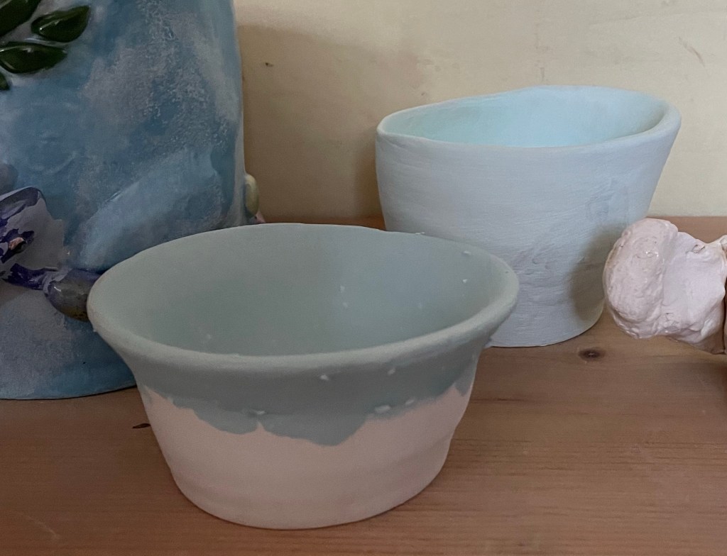Then, I ventured into glazing, working meticulously on the three bowls and even a chicken that I had crafted earlier.