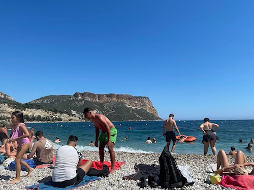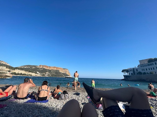 Before I get into it… let me detail Cassis a little bit. Cassis is set up along a giant inlet on the sea, and the town is populated in the surrounding hills and cliffs. It is hilly, folks. We were staying in an Air BNB in the middle of the hills. It was a quick walk down to every hot spot and beach in Cassis. We decided to go to the locals’ beach, Bestouan Beach on our first day. This beach is very unusual, at least in my opinion, for it is not a beach with sand, but rounded rocks and pebbles. No sand! Our second day we headed to the main beach, which was very traditional to what California beaches are like.
